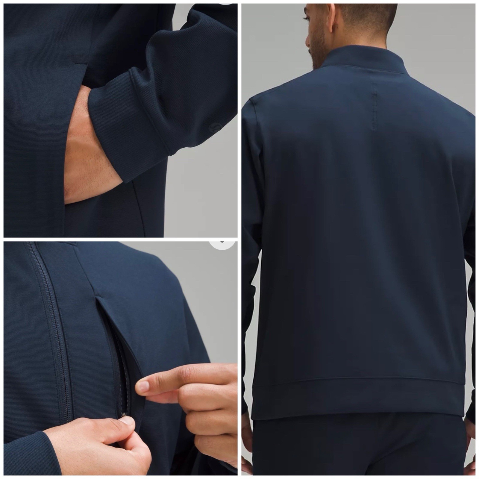 Lululemon Men's Sojourn Track Jacket Full Zip True Navy Size M Pit to pit 20.5” Shoulders 17” Sleeve length 25.5” Length 25” Excellent condition Body: 100% Elastomultiester Pockets: 86% Recycled Polyester, 14% Elastane