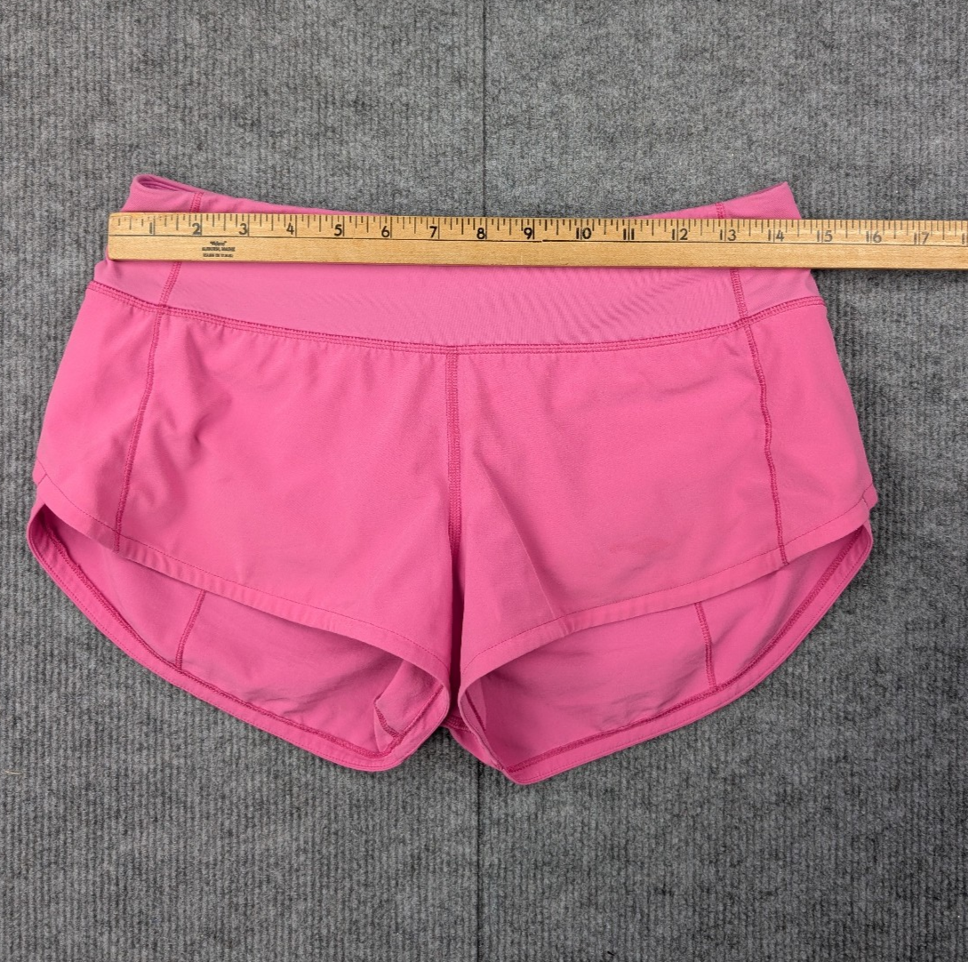 Brand: Lululemon Size: Womens 7 Size Type: Regular Type: Athletic Shorts Color: Pink Pattern: Solid Style: Running Shorts Material: Nylon / Spandex Blend (typical Lululemon athletic fabric) Closure: Pull On Features: Stretch, Lightweight, Built-In Liner, Athletic Fit Performance/Activity: Running, Training, Gym, Yoga, Athleisure Department: Womens Pre-owned. Please see photos for condition and details. Some fading and discoloration as shown