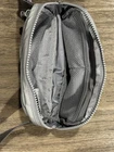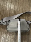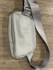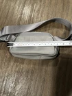 The Lululemon Belt Bag Vapor Silver White is a versatile and stylish athletica crossbody purse. Made of durable nylon material, this belt bag features a zip and buckle closure, with a gray strap accent. The exterior color is a classic silver white, while the interior lining is a sleek white mesh material. Perfect for women on-the-go, this Lululemon Everywhere Belt Bag is both functional and fashionable, offering a convenient way to carry your essentials while staying active.
