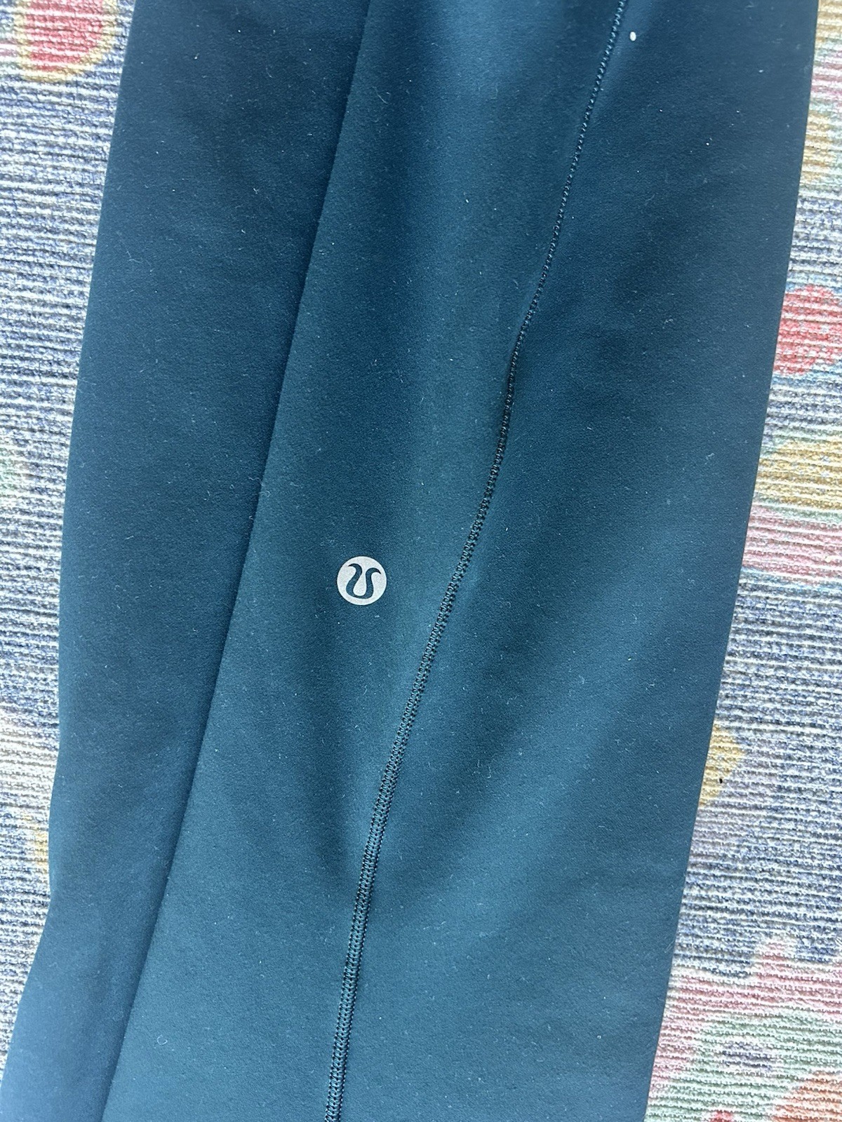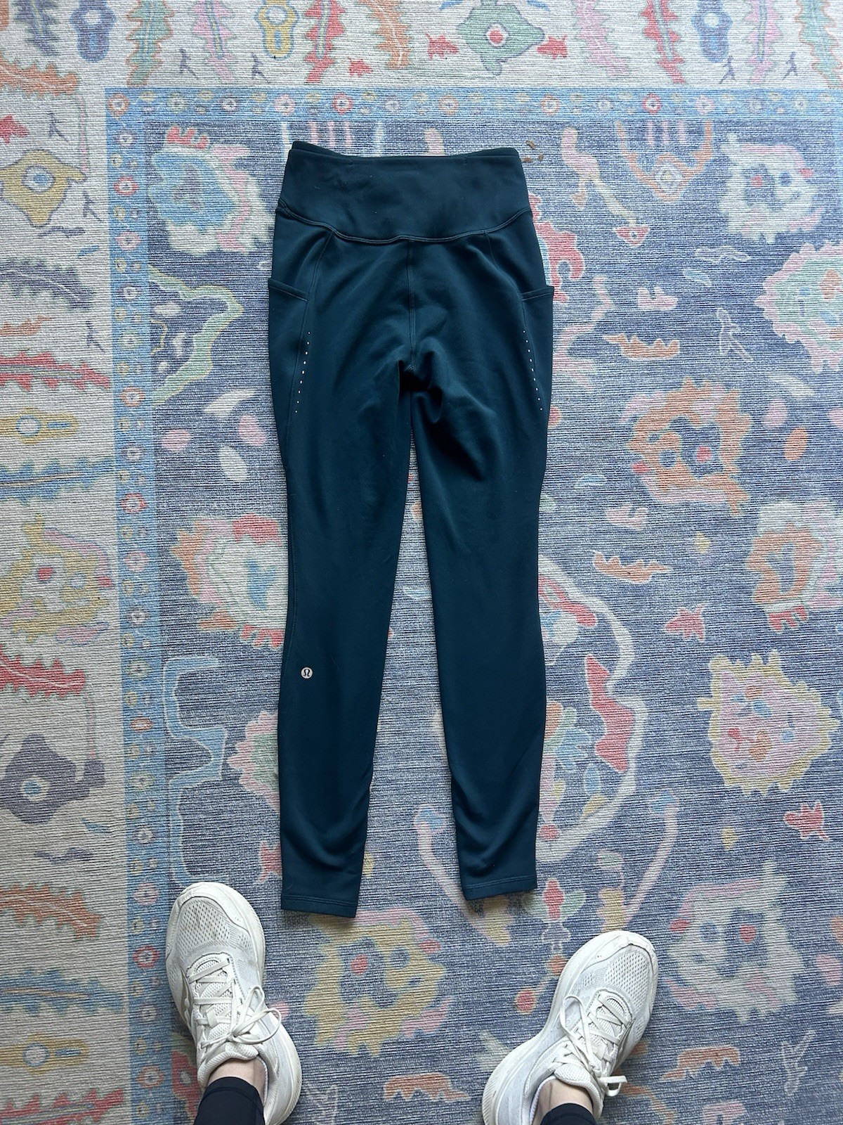 Sleek teal leggings. Perfect for workouts. Comfortable fit. I bought these a couple weeks ago. I’ve worn them twice, but then I realized they were too big. I typically wear a size 4, but thought I would try a size 6 for more breathing room, but then realized they were too big. They are in perfect shape. They are nice and warm for cold weather. I am 5’2, so these were a little bit too long for me as well. They definitely covered to ankles