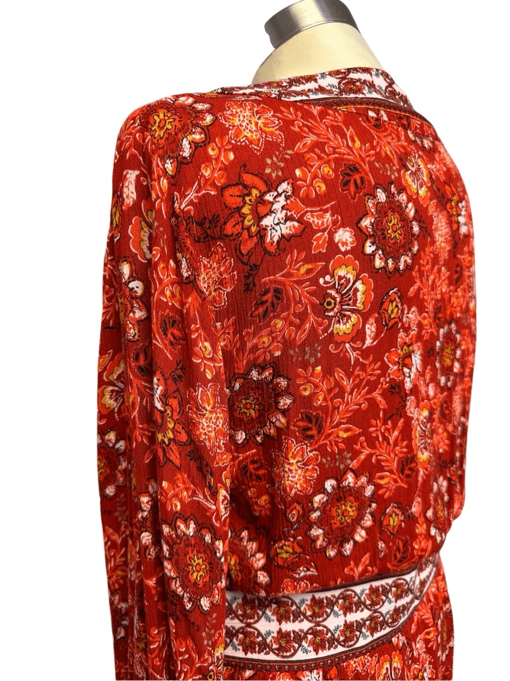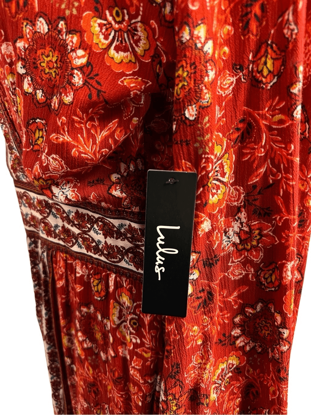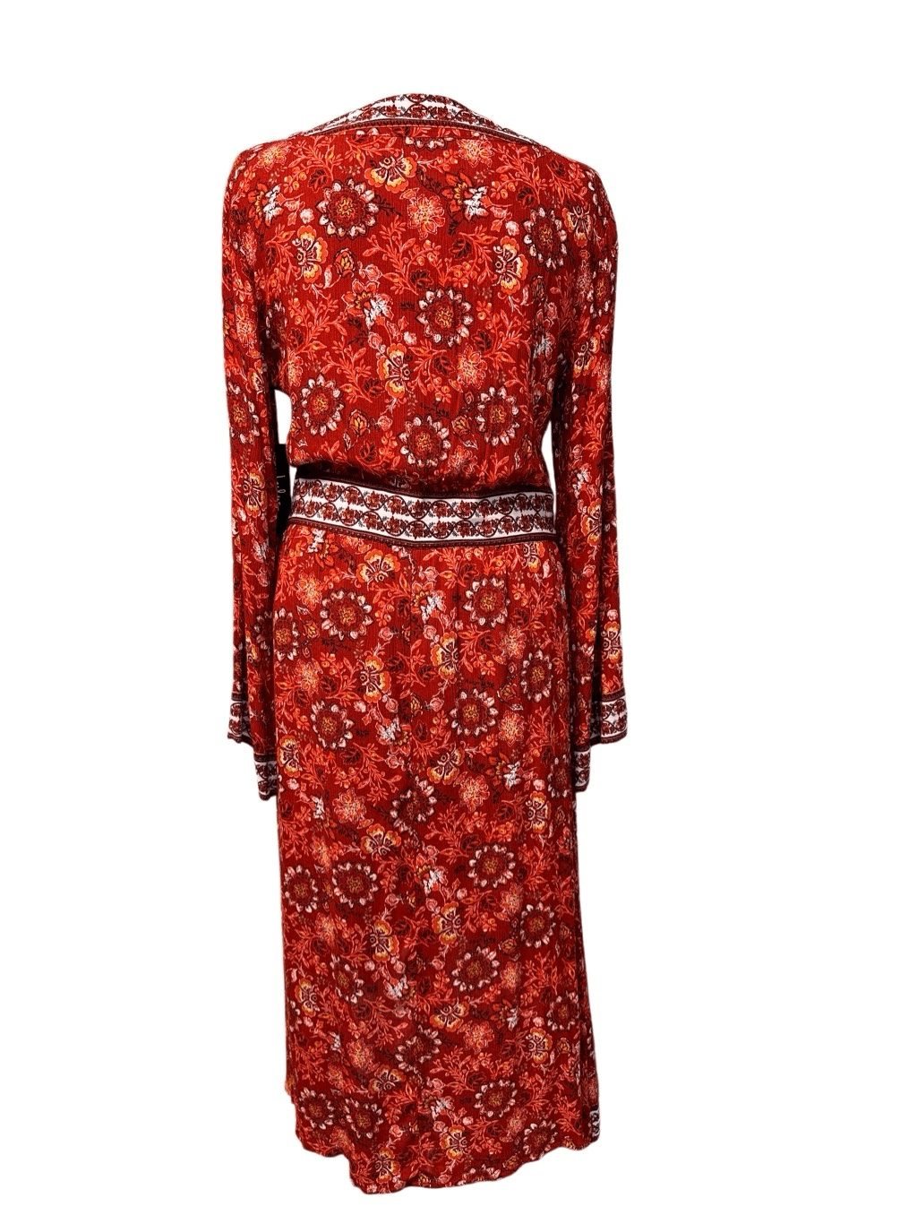 Lulu’s Dress Daydream Red Floral Bell Sleeve Dress. New With Tags. No holes, stains, fading, or pulling. The color is a patterned Orange/Red. This size is L. Bust Measurement (Pit-to-Pit): 20in Length: 48in Measurements are approximate. Smoke free home!