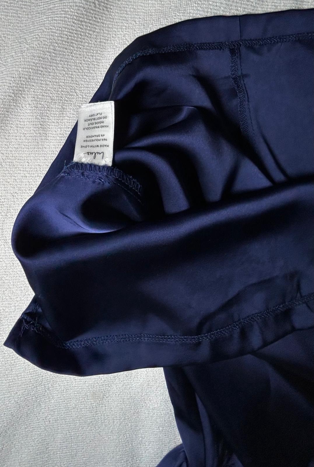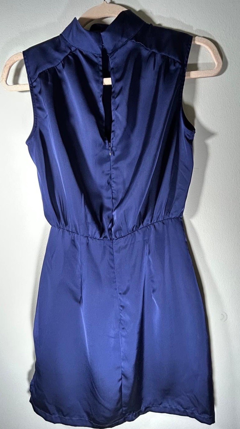 The Lulus Navy Blue Satin Stunning Mock Neck Sleeveless Mini Dress in size small is a stylish and elegant choice for various occasions. Made of polyester material, this solid-colored dress features a mock neck neckline and a zip closure. With a dress length that is perfect for a party or cocktail event, this mini dress from the brand Lulus is versatile for all seasons and can be worn in winter, summer, fall, or spring. Its colorful theme adds a pop of fun and flair to your wardrobe.