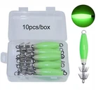 Description: Brand: Shaddock Fishing Material: Environmental protection PE, stainless steel hook Color: Green Total Length: 10.4cm/4.1inch Weight: Appr. 15.56g/0.55oz Luminous Body, glow in dark, attract more squid lures. Enjoy fishing. Package Includes: 5 or 10 pcs Luminous Squid Fishing Hook Plastic Box package, easy to carry and good storage Features: This squid hook is specially designed for squid fishing This hook is cover with special fluorescent glue which have luminous effect This squid is look like umbrella can use in any territorial waters Is an essential thing to catch squid