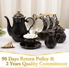 【Luxury British Style Tea Set in Golden Trim】This beautiful teapot set comes with 1 teapot (40oz), 6 porcelain teacups (7oz), 6 saucers (6in), 6 spoons, 1 sugar bowl (12oz), 1 creamer (8oz) & 1 exquisite stand. Pumpkin design and petal edge decorated with golden trim, it can be a great coffee or tea set for entertainment with your friends, an elegant way to enjoy your life. 【Food-Grade Porcelain Tea Set, Let You Enjoy Tea Tasting at Ease】All the pieces of the tea set are made of high-quality porcelain clay, which are food-safe and lead-free. The Edge comes with German Heraeus gold glaze, an upgraded artwork for your daily use. This set has a beautiful pumpkin shape, a distinct glaze color, and a smooth texture. Safe to use and exquisitely shaped tea set to make you feel happy. 【We Care about Every Detail】This black set has a tea tray, it's very easy for you to hold and store. The bottom of the cups and pots are frosted to prevent slipping off the smooth table. Our teapot has a built-in filter, allowing you to brew loose tea leaves. So you can enjoy the blooming of scented tea in hot water, and it is easy to clean, You can wash it by hand. 【Perfect Gift Idea for Tea/Coffee Lovers】The elegant tea gift set makes the perfect gift for occasions, like Mother's Day, weddings, anniversaries, Christmas, Valentines, birthdays, or other gift-giving opportunities. The decent design also makes a great home decor, you will surely enjoy having guests with this set on your table, not matter with black tea, green tea, flower tea, milk or coffee. Comes with an exquisite package, which is much safer, and better for Environment.