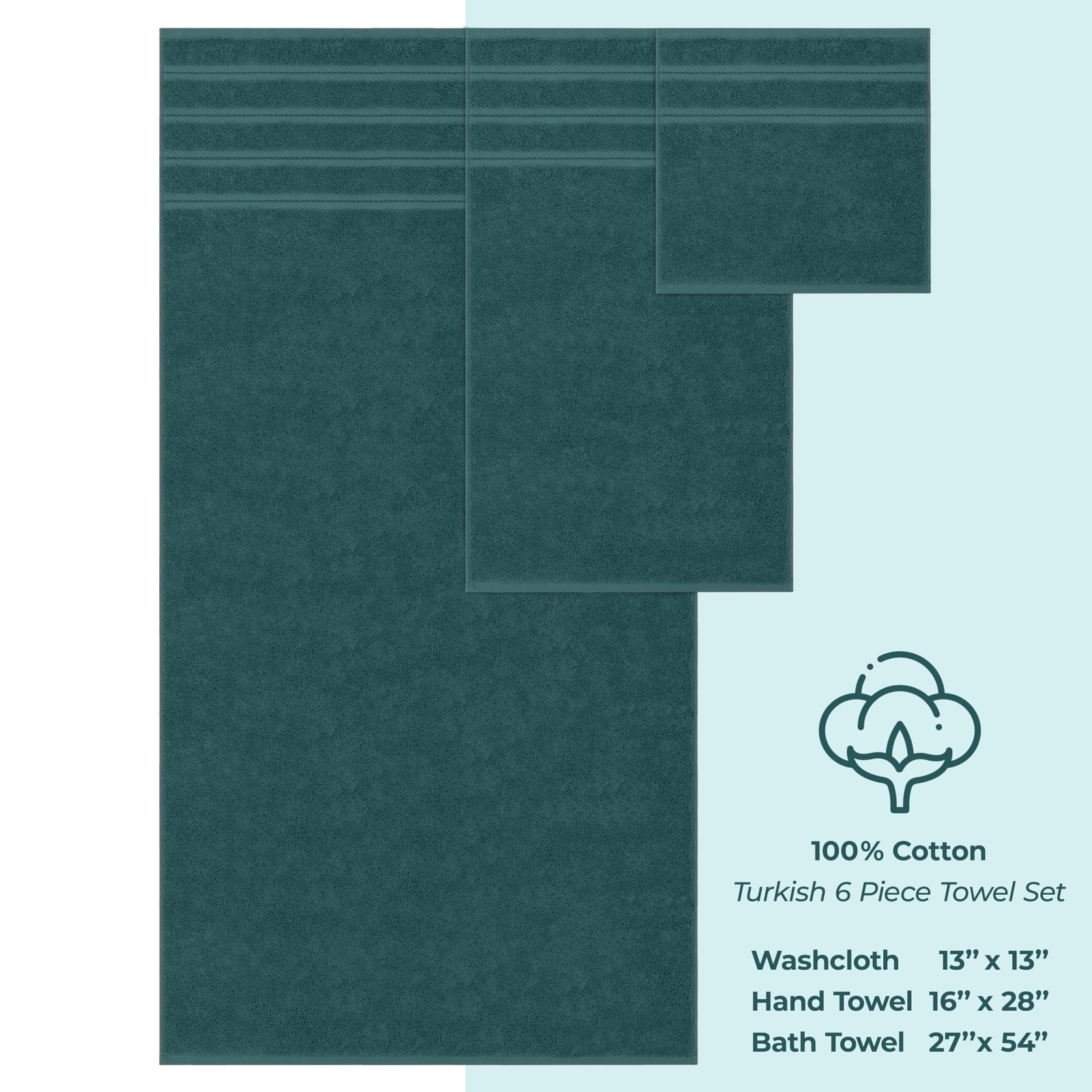 Luxury 6 Piece Towel Set, 2 Bath Towels 2 Hand Towel 2 Washcloths, 100% Cotton Turkish Towels for Bathroom, Teal Towel Sets ✅ Turkish Luxury 6 Piece Towel Set Includes 2 Bath Towels of 27 x 54 inches, 2 Hand Towels of 16 x 28 inches and 2 Washcloths of 13 x 13 inches. ✅ 100% Cotton Turkish Towel Set is 600 GSM. These Bathroom Towels are Soft, Absorbent, Thick and Quick Drying enough for your Body , Hand and Face after Shower. Machine Washable Bathroom Towel Set ! ✅ These Towels are OEKO-TEX STANDARD 100 Certified and OEKO-TEX STANDARD 100 keeps you and your family safe by testing [each component of] a certified product against a list of over 1,000 harmful substances. ✅ Due to variances in computer color management and monitor settings the color displayed on customer screen may differ from the actual product color. ✅ THIS ITEM IS RETURNABLE AND COMPLIES WITH AMAZON'S AND RETURN POLICY. Introducing our exquisite 6-Piece Bath Towel Set, meticulously crafted from 100% Turkish cotton to elevate your bathroom experience to unprecedented levels of luxury. Our towels are designed to cater to your every need, ensuring utmost comfort and indulgence. Wrap yourself in the lavish softness of our extra-large towels, boasting a plushness that's unmatched. Made with a thick and absorbent weave, these towels provide a quick-dry feature, ensuring you stay fresh and dry after every bath. The oversized design of our towels offers ample coverage, whether you're drying off your body, hands, or face. Each piece in this set is meticulously crafted to meet the highest standards of quality and comfort, promising a spa-like experience within the confines of your home. Transform your bathroom into a sanctuary of relaxation with our premium hotel and spa-quality towels. Their luxurious texture and superior absorbency make them ideal for pampering yourself after a long bath. Not only do our towels provide unparalleled comfort, but they also make for an exquisite gift. Whether it's for your family, friends, or to enhance the guest experience in your home, our towels are the perfect choice. They are also an ideal addition to any dorm room, adding a touch of plushness to the college experience. Upgrade your bathroom essentials today with our 6-Piece Bath Towel Set and experience the epitome of comfort and luxury. Dive into a world of opulence and relaxation with our premium Turkish towels - your ultimate companion after every bath. Teal 6 Piece Bath Towel Set Shipping We offer FREE shipping on all orders! We ship within Three business days of payment, usually sooner. We use a selection of shipping services such as UPS, FedEx, USPS etc. We only ship to the lower 48 states, no APO/FPO addresses or PO Boxes allowed. Local pickups and combined shipping options are not provided at this time. Return You can return a product for up to 30 days from the date you purchased it. Any product you return must be in the same condition you received it and in the original packaging. Please keep the receipt. Payment We accept payment by any of the following methods: PayPal Please pay as soon as possible after winning an auction, as that will allow us to post your item to you sooner! Feedback Customer satisfaction is very important to us. If you have any problem with your order, please contact us and we will do our best to make you satisfied. Contact Us If you have any queries, please contact us via ebay. We usually respond within 24 hours on weekdays. Please visit our eBay store to check out other items for sale! Thank you for shopping at our store.