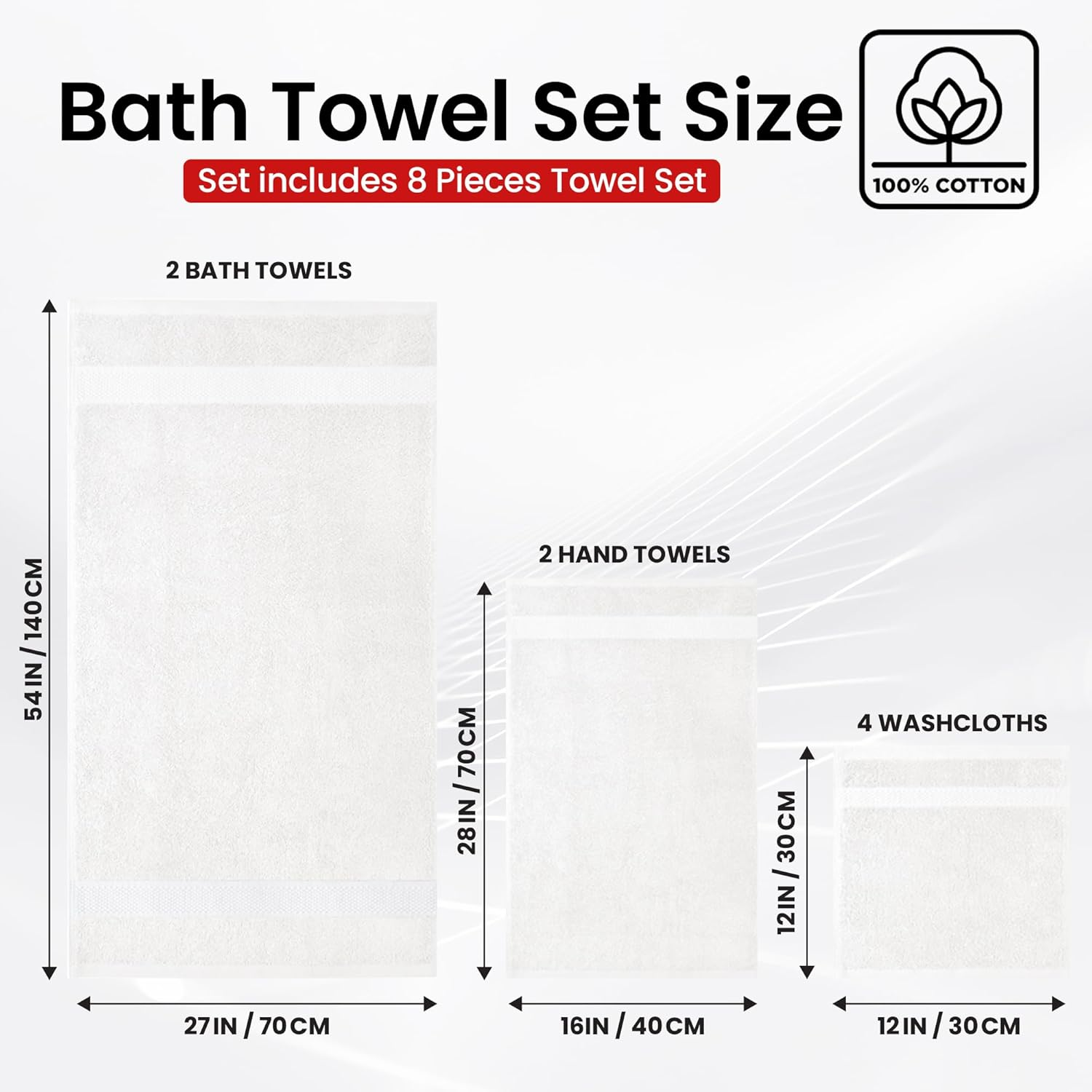 Store New Arrivals Add to Favorite View Feedback Contact Fast deliveries to the customer's home Quality customer service John Make the customers happy! Luxury 100% Cotton Towel Set – 8 Piece Bathroom Towel Set (2 Bath Towels, 2 Hand Towels, 4 Washcloths) – Soft & Absorbent Towels for Bathroom (Brilliant White) Description Bath Towel Set: Our Towel set contains 2 Bath Towels size 27x54 inches, 2 Hand Towels size 16x28 inches, and 4 Washcloths size 12x12 inches. These towel set for the bathroom offers you a home of luxury and tenderness as you cuddle up. Made of 100% Cotton Ring-Spun. A Rewarding Experience: Our products are Standard 100 OEKO-TEX & Made in Green certified, indicating that it has been independently tested and meets the high standards for comfort and wellbeing. After bathing, drying your hands, or wiping your face with a washcloth, indulge in the comfort of enveloping yourself in bath towels. The towel set is the right balance of softness and resilience for regular use. Enduring Durability: Along with its exceptional durability, the premium class towel keeps its softness after several washes. Utilize the Infinite Xclusives Infinitee Bath Towels set for a luxurious bathing experience. Fine, double-needle stitching supports the towel's edges, preventing them from warping or fraying—no more unsightly bathroom towels. Remarkable Features: This plush towel set is ultra-plush, soft, and absorbent, and it grows softer with each wash. Made in Green certified the gold standard for items that are both healthy for you and the environment. Care Instructions: Separately wash for best results. Due to the 100% cotton towels, there may be some lint on the first wash, but it should diminish with subsequent washes. There will be no difference in the appearance, feel, or performance of your towel set. Avoid using skin care products to avoid towel spots or bleaching. Product Description The video showcases the product in use. The video guides you through product setup. The video compares multiple products. The video shows the product being unpacked. Our Collection Customer Reviews 4.5 out of 5 stars 1,425 4.5 out of 5 stars 7,292 4.5 out of 5 stars 7,292 4.5 out of 5 stars 7,292 4.5 out of 5 stars 7,292 4.5 out of 5 stars 7,292 Price $29.59 $ 29 . 59 $33.24 $ 33 . 24 $31.34 $ 31 . 34 $21.84 $ 21 . 84 $21.84 $ 21 . 84 $16.14 $ 16 . 14 Double Stitched Hem ✔ ✔ ✔ ✔ ✔ ✔ Absorbent ✔ ✔ ✔ ✔ ✔ ✔ Set Includes 4 Piece Towel 2 Towels, 2 Hand & 4 Washcloth 2 Piece Bath Sheet 6 Piece Hand Towel 12 Piece Wash Cloths 12 Piece Wash Cloths Material Ring-Spun Cotton Ring-Spun Cotton Ring-Spun Cotton Ring-Spun Cotton Ring-Spun Cotton Ring-Spun Cotton Colors 10 10 10 10 10 10 Item model number BTHTWLWHT Unit Count 8.0 Count Special Feature Lint Free Customer Package Type Cardboard box Color Brilliant White Pattern Solid Product Dimensions 54"L x 30"W Material Cotton Country of Origin Pakistan Shape Rectangular Fabric Type 100% Cotton Item Weight 3.61 pounds Theme No Theme Number of Items 8 Age Range (Description) Adult Towel form type Bath Towel Model Name INF-BTHTWL8 Specification Met Standard 100 OEKO-TEX & Made in Green certified Size Towel set ABOUT US We offer the best prices around on high quality products. Our E-store includes media such as books, movies, music and games while offering electronics, toys, sporting apparel, clothing, tools, general home, garden items and more. SHIPPING We are always working hard to ensure your package arrives as soon as possible. Please understand that some factors like weather, high postal traffic, and the performance of shipping companies are outside of our control. We offer free shipping to the lower 48 states and ship within 2 business days of payment, usually sooner. We do not accept P.O. Boxes. Please provide a physical address. For shipping outside of the continental USA, we only use eBay's Global Shipping Program. The item is shipped to KY and then sent to the rest of the world. International customers are responsible for all duties and taxes. Continue to 'check out' to calculate costs for shipping the item to your country. Messages regarding eBay's Global Shipping Program MUST be directed at eBay EXCLUSIVELY. RETURNS We offer a 30-Day Return Policy on items in which you are not completely satisfied with. You have the option of a full-refund or an exchange of the item. No returns are available on items shipped outside of the USA PAYMENT We accept PayPal. CONTACT US This page content is yet to come Please ad us to your favorite seller and visit again later Thank You CUSTOMER SATISFACTION We try our very best to make sure every customer is completely satisfied. If there's a problem, message us! We're happy to help. WE ACCEPT