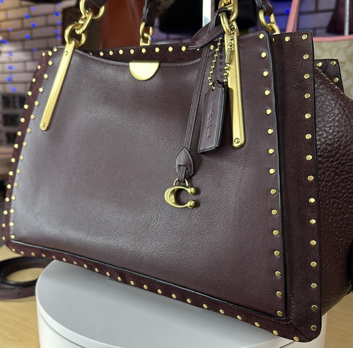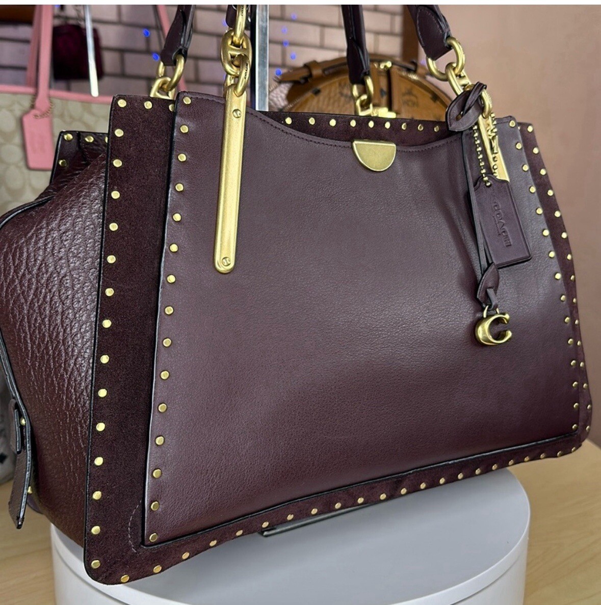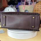 Crafted in a mix of leather and suede detailed with smooth rivets, the generously proportioned 36 features a three-compartment design, modern hardware and a Signature charm. Smooth leather, buffalo-embossed leather and suede Inside zip and multifunction pockets Zip closure, fabric lining Side snap pockets Handles with 6 3/4" drop Detachable strap with 18" drop for shoulder or crossbody wear Instantly change the look of your bag with an interchangeable strap. 14 1/4" (L) x 9" (H) x 5 1/4" (W) Retailed for $700.00 SOLD OUT on Coach