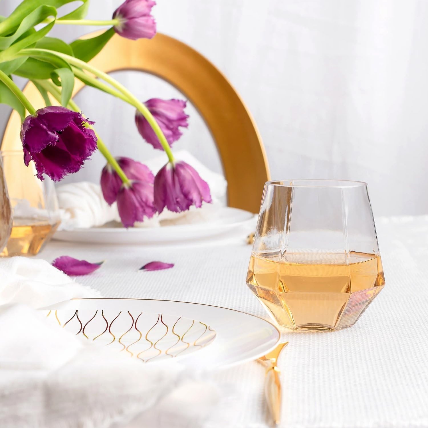 These elegant and practical wine goblets are a must-have for the frequent party hostess! Use it for Whiskey Glasses, Scotch, Bourbon Glasses, wine cups, champagne cups, cocktail cups, juice cups, dessert cups, and more. ELEGANT CRYSTAL GLASSWARE: Enjoy a luxurious wine-drinking experience with these premium, lead-free crystal stemless wine goblets that add a touch of sophistication to your table setting DURABLE GLASSWARE: Invest in high-quality, sturdy wine goblets that withstand the test of time, featuring a solid base for enhanced stability and an ergonomic grip for comfortable sipping PREMIUM DIAMOND-CUT DESIGN: Impress your guests with the exquisite diamond-cut pattern adorning these stemless wine goblets, reflecting light beautifully and elevating the look and feel of any occasion TASTEFUL TABLESCAPES ENHANCER: Achieve a picture-perfect tablescape with these gorgeous crystal wine goblets, perfect for dinner parties, romantic evenings, or quiet nights in, complementing any décor or theme IDEAL GIFT FOR WINE ENTHUSIASTS: Treat the wine lovers in your life to a set of six stunning, 12 oz diamond-cut stemless wine goblets, making for a memorable and thoughtful gift for birthdays, weddings, anniversaries, or housewarmings