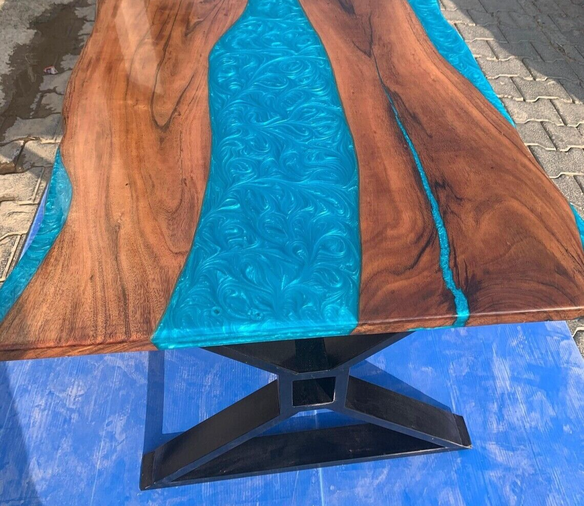 Transform your kitchen and dining space into a coastal haven with our stunning blue walnut epoxy table. Meticulously handcrafted, this one-of-a-kind piece seamlessly blends the warmth of walnut wood with the ethereal beauty of ocean-inspired epoxy resin. Key Features: Natural Elegance: The table is crafted from high-quality walnut wood, showcasing its natural grains and warm tones. Each piece of wood is carefully selected for its unique character. Epoxy Resin Artistry: The tabletop features a captivating epoxy resin design that mimics the fluidity and movement of ocean waves. Swirls of blues, greens, and whites create a mesmerizing visual experience. Durable and Functional: The epoxy coating not only adds a stunning aesthetic but also provides a durable, heat-resistant, and easy-to-clean surface, making it ideal for daily use in your kitchen and dining area. Versatile Design: Whether you're hosting a dinner party or enjoying a family meal, this table seamlessly blends into various decor styles, from coastal and rustic to modern and contemporary. Custom Craftsmanship: Each table is handcrafted by skilled artisans, ensuring a level of craftsmanship and attention to detail that sets it apart from mass-produced furniture. Specifications: Dimensions:60"x30" Inches Materials: High-quality wood, epoxy resin Colors: Blue Finish: Glossy and durable Shipping and Packaging: * We can make the table top similar to this as it is handmade or natural process you will not get the same as shown in picture but you will get the similar one * The table top is made in Agra India & fully handmade. * The top will be delivered by FedEx or DHL free of cost door to door. * If there is any local tax, custom duties or Vat will be paid by the buyer at the destination. * The parcel is dispatch with proper packing & fully insured covering all kind of risk. Thanking You...