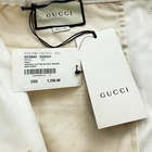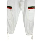 Straight-leg panelled cotton canvas cargo pants in off-white Mid-rise. Four-pocket styling Belt loops at elasticized waistband Press-stud flap pockets featuring textile logo flag and webbing trim in red and green at outseams Drawstring at elasticized cuffs Zip Fly Brand New With Tags MSRP: $1,250 Very Minor Hard To Notice Stains At Right Pant Cuff Size: IT50/US36 Color: Off White Condition: New WIth Tags Material: 100% Cotton Measurements: Waist: 17.25" Rise: 12" Inseam: 30" Length: 42"