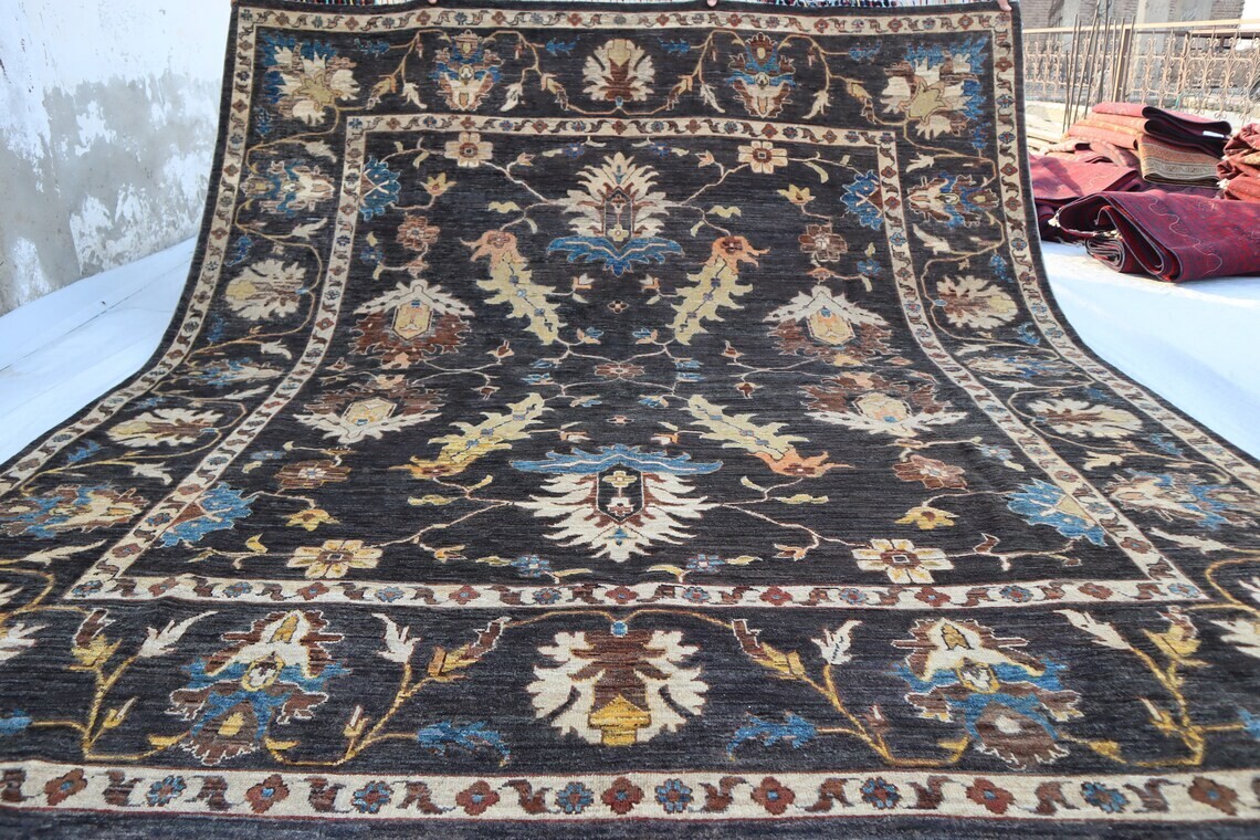 Elevate your space with this exquisite hand-knotted wool carpet, featuring a timeless traditional oriental design. The rich black base is adorned with intricate floral and geometric patterns in shades of blue, beige, and brown, making it a perfect statement piece for any living room, bedroom, or office. Key Features: ✔ Oushak Rug ➤Completely new area rug ➤100% hand-knotted and hand finished ➤Due to the hand-made nature of the rug, size may vary by 2 to 3 inches. Please let me know your requirements in case a specific measurement is required. ➤ Uses the old traditional techniques and designs of the migrated masters of the Orient ➤One of a kind incredible design and color palette ➤ High-Quality Natural Wool ➤ Has a very rich and soft pile ➤ Dyed with natural colors ➤ At no point chemicals, colors, or processes were used in making this rug ➤ Multiple sizes are available, some for immediate delivery and others made-to-order. ➤ Make-to-order rugs take about 30–40 days ➤Free, expedited shipping everywhere ✔ Perfect for Traditional & Modern Interiors Care Instructions: Vacuum regularly to maintain its appearance. Spot clean with a mild detergent or seek professional cleaning for best results. Add sophistication and warmth to your home with this luxurious hand-knotted wool carpet. Fast shipping and secure packaging guaranteed. Feel free to message for additional details or custom inquiries. All Carpets in My Store are Made up of 100% wool, this exquisite hand Knotted rug is durable with a gentle feel. A medium-thick pile in contrasting heights adds delightful decorative complexity, while still maintaining softness & warmness underfoot. The defining details of this rug are sure to make it a conversation piece and an icon of your household. It is a joy to step out of bed in the morning onto these rugs and also perfect for rolling out in a calming nursery or a delightful playroom. Material used:- WOOL AND COTTON PLEASE NOTE:- The images we display have the most accurate color possible. Due to differences in computer monitors, we cannot be responsible for variations in color between the actual product and your screen. Please be advised that in some cases patterns and colors may vary according to size Feedback 1. We depend on our customer satisfaction to succeed. therefore, your feedback is extremely important to us. 2. If you are satisfied with our service, please leave positive feedback to us. thank you! 3. Contact us before leaving any negative or neutral feedback, we will try our best to solve any problems. Terms 1. We will check all the product before shipping to you. 2. If the item is defective, please contact us at once, we will send a solution the first time. 3. Any import charges or fees are the buyer's responsibility. 4. Please check out your ADDRESS carefully when processing an order. 5. Feel free to contact us with any question or query, and any other things like for bulk orders or any custom order we will offer you a satisfying answer. Shipping: All items will ship promptly after payment has cleared Payneer. Please provide the correct and updated address and Contact Number for shipping. Usually takes 5-15 business days for the delivery. Note :- We offer Free Shipping All Across The World. Thanks for Visiting UK HOME FURNISHING