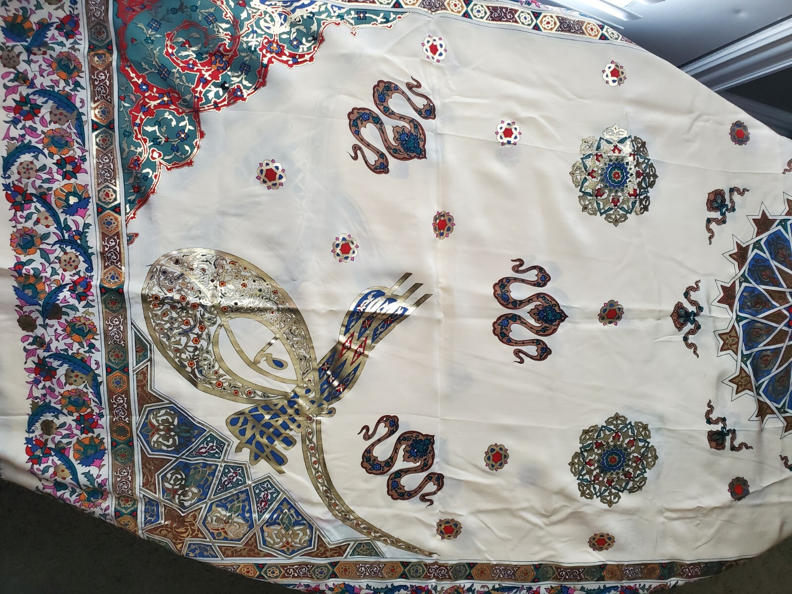 Leave an impression and stand out in the ground in this stunning, Brand New Silk Scarf in Sayoko Yamaguchi box. 60" x 29.5" Genuine Gold Leaf Imprint. Never worn. Beautiful, jewel-toned colors. Use as a head scarf or wrap to show off your impeccable taste!