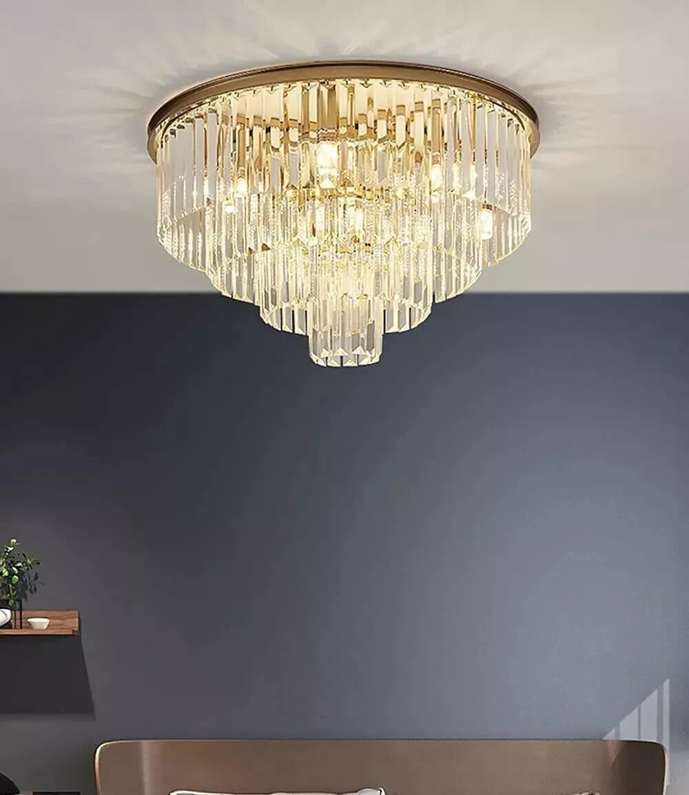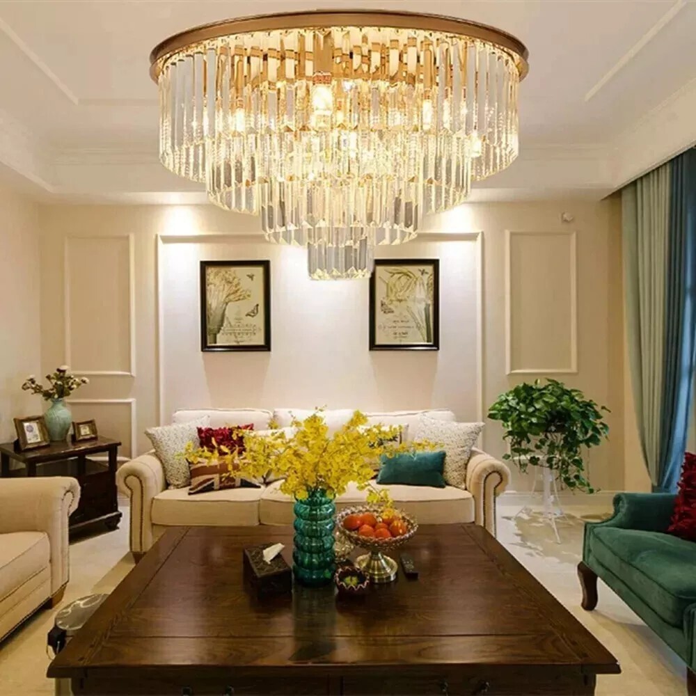 Luxury K9 Crystal Chandelier Modern Flush Mount Ceiling Lamps Lighting w/Remote Details: Color: Gold Material: Metal, K9 Crystal Size: Diameter-60cm(23.6"),Height:40cm(15.7")(4-Layers Crystals) Diameter-80cm (31.5"),Height:50cm(19.7")(5-Layers Crystals) Light Base: With E14 light socket (Not Included E14 light Bulbs) Voltage:110V Wattage :60 watts Switch: Only Diameter-80cm (31.5") comes with Remote Control,the Diameter-60cm(23.6") doesn't come with remote control. Applicable: living room, bedroom, restaurant, etc. Packaging details 1 * light pack in foam carton box. Suggestion: Installation By A PROFESSIONAL ELECTRICIAN Assistant after sales: For any question or installation methords about the light fixture,pls contact us via ebay message firstly for help. Payment Delivery details Terms of sales About us Contact us Payment You could make payment via: Delivery details Packages will ship via by UPS or USPS within our handling time,once the package is shipped out ,normally shipping takes about 3-10 working days,but due to different cities and states,shipping time will be different. Terms of sales If you any problem about shipping information, or the item you got : Arrived damaged; Wrong item sent; Missing parts or pieces; Doesn't work or defective; Doesn't match description or photos. Pls click "Contact Seller" and send us message firstly. Then we could have a check and will take responsibility to resolve the problem with you in good communication. About us Our company specializing in selling all kinds of light fixtures,such as ceiling fans,chandeliers,crystal lights,retro lamps,pendant light,etc. If there's any light fixture you are interested,pls feel free to contact us for more details. Contact us Normally your message will be replied in 1 business day,If after 24 hours you do not receive our reply,please kindly re-send us the message,because sometimes ebay message system will have technical problem,so your message can't send to us successfully.