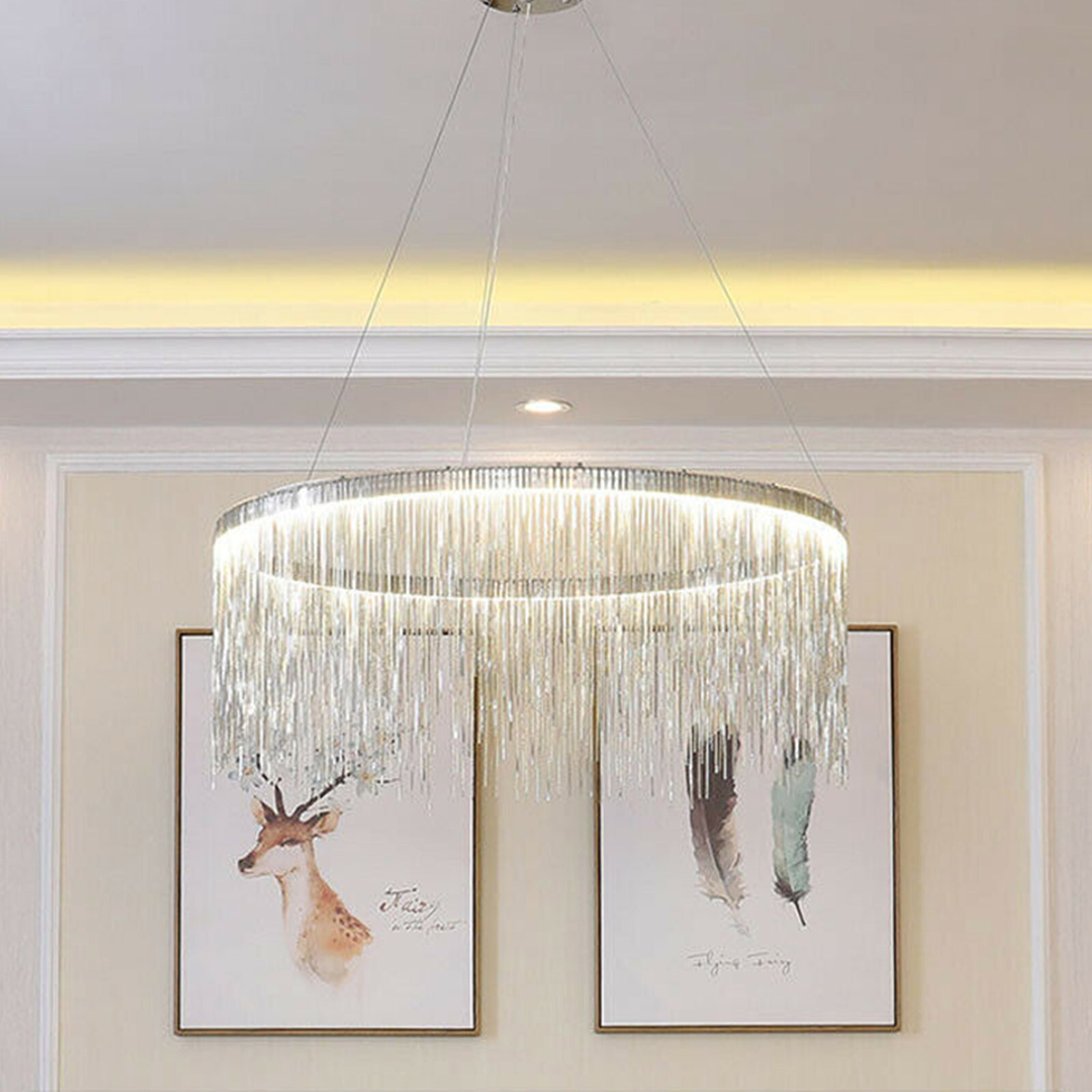 Luxury LED Dimmable Modern Linear Chandelier Tassels Chrome Chain Pendant Light 1. Description 1* Chandelier Light Application: Living Room, Corridor, Bedroom, Bars, Dining Room, Study Room, Ktv… 2. Features&Highlights ※Dimmable Option, Bright, Comfortable Light, Reduce Eye Fatigue, Protect Eyesight ※Beautiful and Elegant ※Led Light Source, Long Life, Energy Saving, Low Heat, Healthy Environment, High Color Rendering ※Applicable to Different Environments Such As Living Room, Bedroom, Study, Restaurant Etc 3. Specifications Category: Hanging Lighting Style: Modern / Comtemporary Recommended Room Size: 15-25 ㎡ Power:60W Voltage: 85-265V Finish: Plating Materials: Metal Chain Colour: Chrome Number of Lights: LED Weight:8.2kg Lamp Type: LED Lighting Direction: Ambient Light Hanger Line: 100cm Bulb Base: LED Dimensions: Diameter 50cm/19.68inch* Height 32cm/12.59inch Light Source: Led , 3 Colors Switch, Cool Light/ Neutral Light / Warm Light Included in Delivery or Not: Includes Led Light Source reminder:The length of the suspension wire rope is 1 meter, which can be shortened according to customer needs. Payment Delivery details Terms of sales About us Contact us Payment We accept ebay payment 。 Fees such as import duties, taxes are not included in the item price or shipping costs. These charges are the buyer's responsibility. Delivery details Shipping: 2-9 working days to: USA Terms of sales We maintain high standards of excellence and strive for hundred percent customer satisfaction. Feedback is very important to us. We hope that you contact us immediately before you give neutral or negative feedback, so that we can address your concerns. It is impossible to address issues if we do not know about them! About us Your satis faction is our ultimate goal. We work hard to earn your trust and future business. Our certified technicians have tested each item before shipping. The unit comes with 1 year limited warranty on all manufacturing defects. a) If you receive a defective item, you may return it or ask for a discount. Please contact us within 14 days after you receive the package. b) What you returned must be intact and in its original packaging as re? u. Customer is responsible for shipping costs of the returned item. c) We will cover the cost of shipping back t with the shipping rate indicated in the registration page. We will send you a new unit or refund the full payment you paid. Thank you. Contact us Business Hour Business Hour: Monday To Friday: 8:30 AM to 5:00 PM (Beijing China time) Due to time zones, our reply to your questions may not be immediately. But within above working time, we will reply your email within 24 hours. If it's non-workdays, please kindly be patient and wait till Monday. Please contact us with ebay message. Please feel free to contact us if you have any questions. Monday To Friday: 8:30 AM to 5:00 PM (Beijing China time) Due to time zones, our reply to your questions may not be immediately. But within above working time, we will reply your email within 24 hours. If it's non-workdays, please kindly be patient and wait till Monday. Please contact us with ebay message. Please feel free to contact us if you have any questions. On Feb 14, 2025 at 00:11:13 PST, seller added the following information: On Feb 17, 2025 at 00:56:04 PST, seller added the following information: