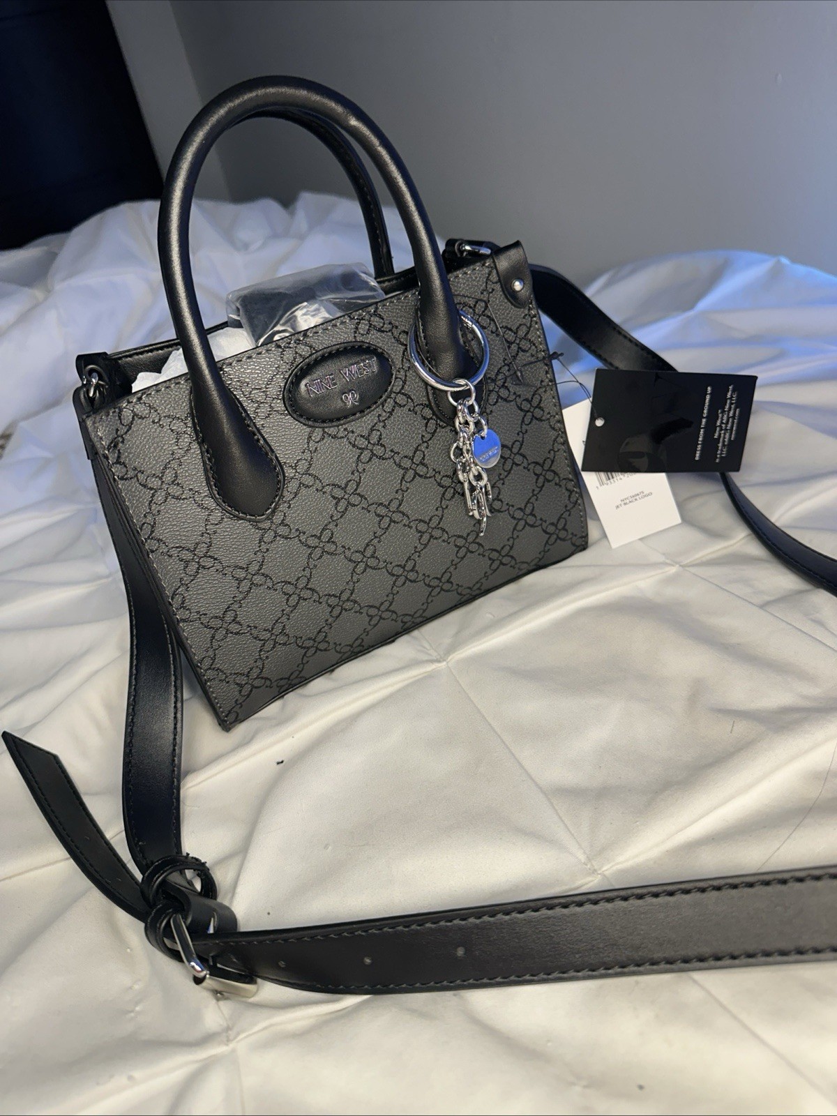 The product is a stylish and luxurious Nine West Candance Mini Tote Crossbody bag in black and gray. This crossbody style bag features a sleek black exterior color with a gray lining color, offering a versatile and chic look. Made from PVC material with PVC handles/straps, this bag is both durable and trendy, perfect for any fashion-forward woman on the go.