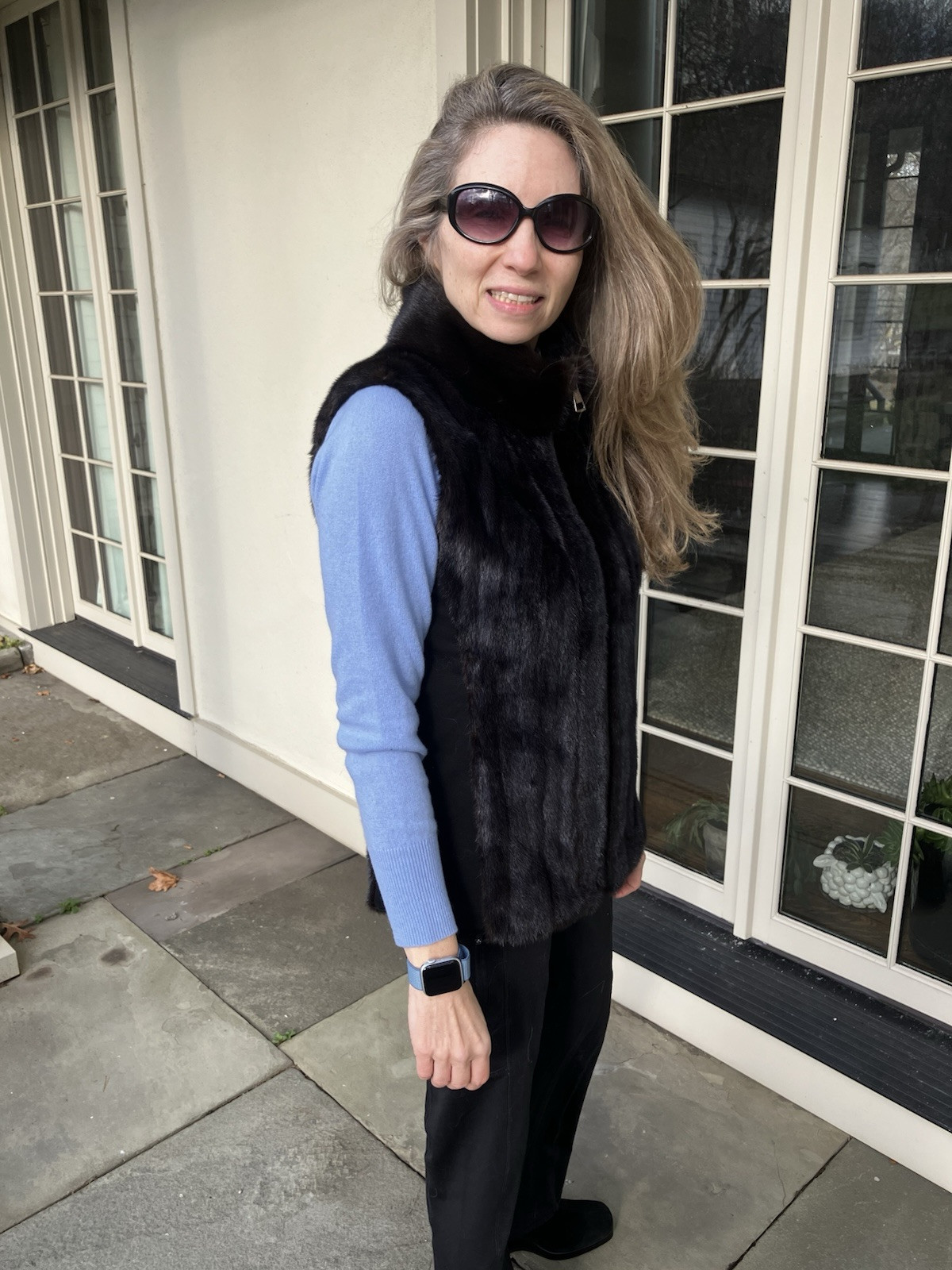 Stunning ranch mink vest with Lycra panels for flattering and comfortable fit. Mink is fully let out female pelts, silky soft and lightweight. Wear the vest outside with a sweater or with something lighter to wear inside as part of an outfit. Soft lambskin leather around the zipper. Interior and exterior pockets. Beautifully made. Bust 38”, length 26”.