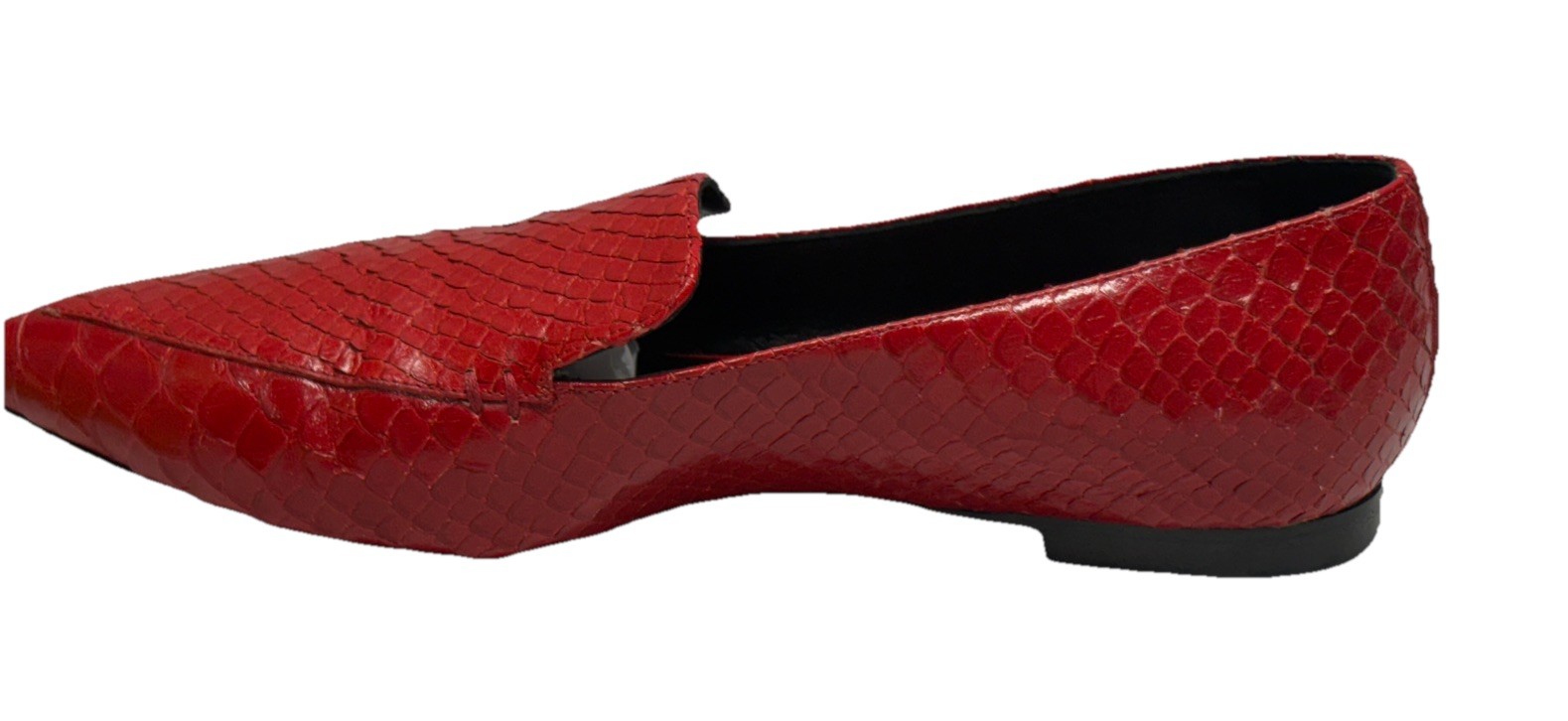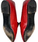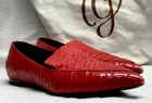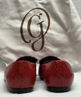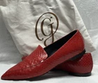 These M. GEMI Italy Snake Skin Red Leather Pointed Toe Loafers are a rare and luxurious addition to any woman's shoe collection. Made in Italy, the shoes feature a striking animal print pattern with a pointed toe design, perfect for adding a touch of elegance to any outfit. The slip-on style and standard shoe width make them comfortable and easy to wear, while the leather lining and insole provide quality and durability. These red loafers are a statement piece that exudes sophistication and style.