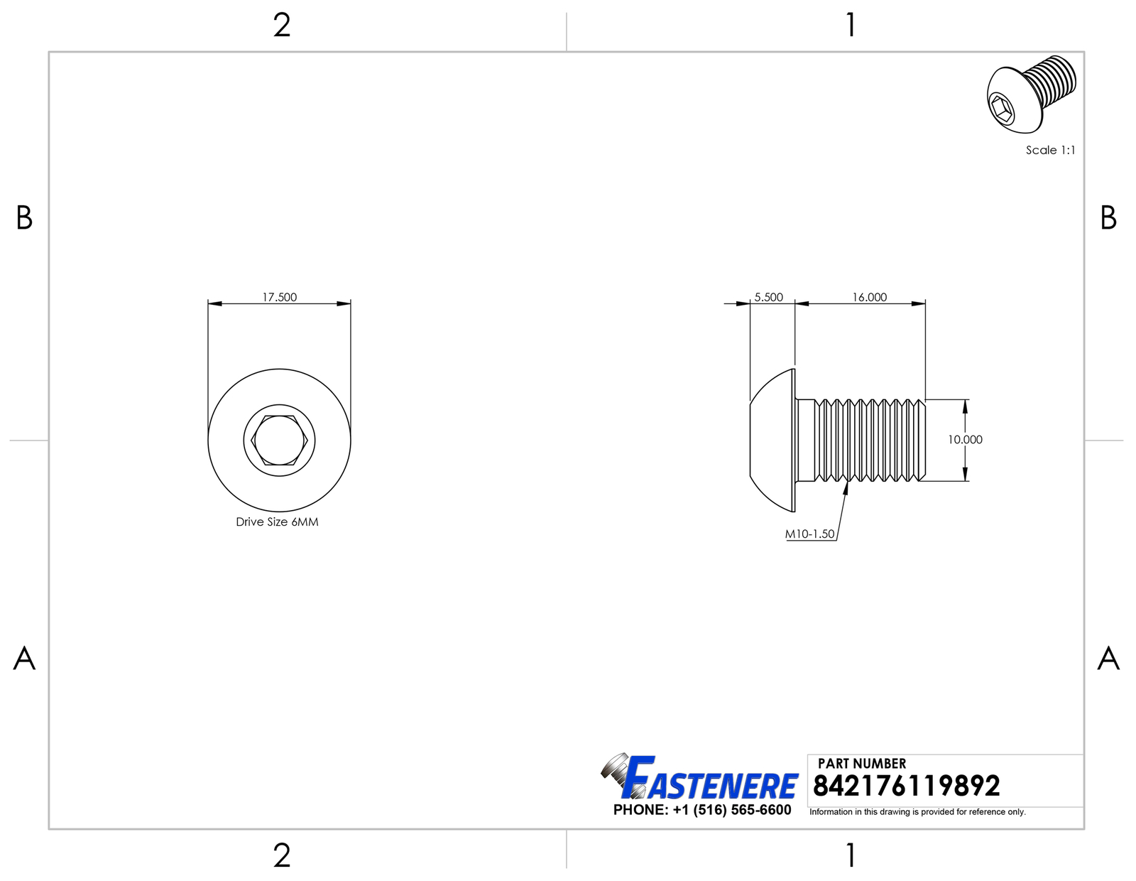 M10-1.50 x 16MM Button Head Socket Cap Screws ISO 7380 Stainless Steel Qty 250 General Product Information Head Style : Button Drive Style : Allen Hex Key Drive Size : 6MM Thread : M10-1.50 Length : 16MM Quantity of Fasteners in Package : 250 Material Type : Stainless Steel Grade Rating : A2-70 Detailed Product Information: Head Diameter : 17.5MM Head Height : 5.5MM Thread Diameter : 10MM Thread Coverage : Full Thread Key Notes: Socket cap machine screws are precision fasteners that are known for their quality and durability. They are designed to meet challenging fastening applications in a variety of industries such as construction, automotive, and product manufacturing. They are also known for their efficient application performance and endurance. Button is low domed style head with a wide bearing surface that is perfect for use on applications in tight spaces. Hex socket screw drive has a hexagonal recess and may be driven by a hex key or Allen wrench that allows for high torque wrenching in tight spaces. The vast majority of stainless steel fasteners are produced with metals from the austenitic family. Their high levels of chromium and nickel provide tough corrosion resistance and the ability to withstand considerable physical strain without fracturing, albeit at a higher cost than the martensitic varieties. Made of stainless steel grade 18-8 which offers a high level of chemical and corrosion resistance and strength that will out perform and out last all zinc plated fasteners for years with out the need to perform costly and time consuming maintenance. Shipping: All orders placed before 3:30 pm EST Will Ship Same Day Tracking is provided on ALL Orders Priority Mail Shipping service is offered at a discount of only $3.95 UPS Ground UPS Next Day Air is available, Please inquire for pricing Returns : ALL returns are accepted if returned within 60 days. Money Back or exchange guaranteed. NO Restocking Fees. For YOU, we constantly strive to find ways of improving our performance.