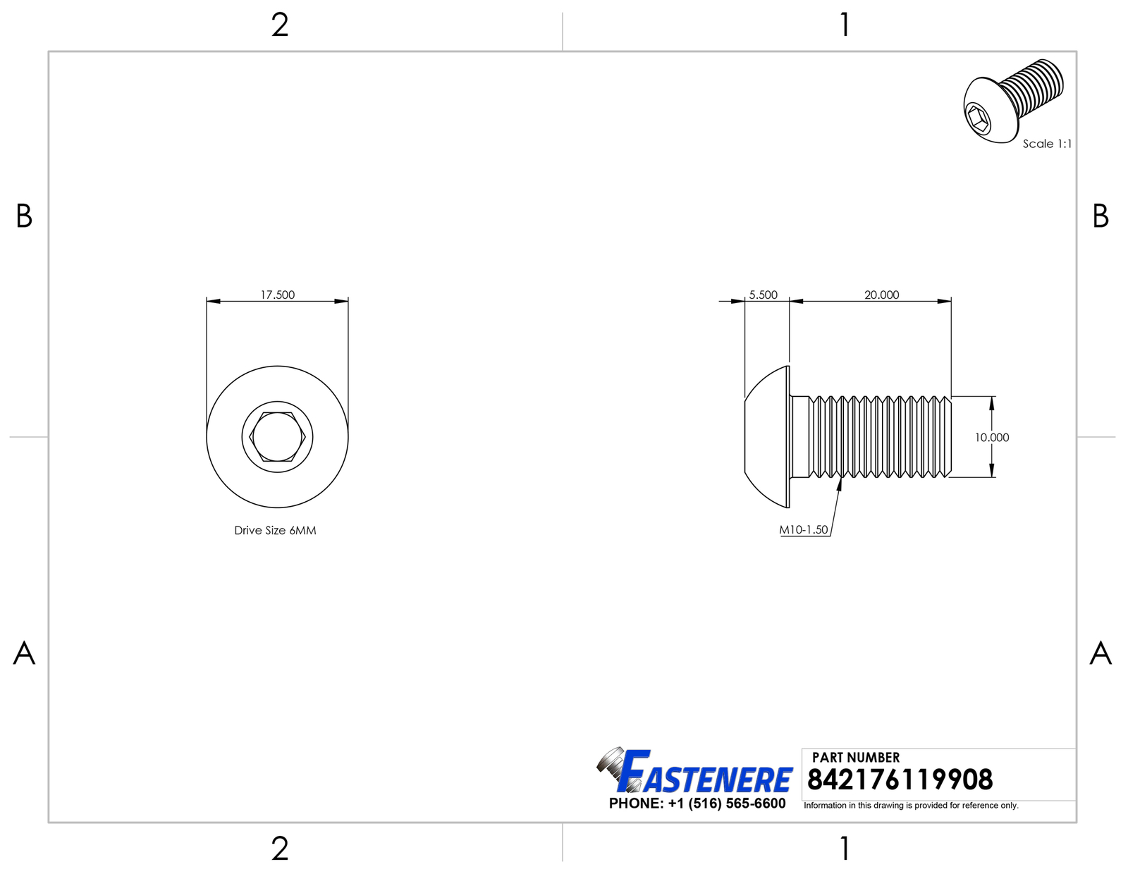 M10-1.50 x 20MM Button Head Socket Cap Screws ISO 7380 Stainless Steel Qty 100 General Product Information Head Style : Button Drive Style : Allen Hex Key Drive Size : 6MM Thread : M10-1.50 Length : 20MM Quantity of Fasteners in Package : 100 Material Type : Stainless Steel Grade Rating : A2-70 Detailed Product Information: Head Diameter : 17.5MM Head Height : 5.5MM Thread Diameter : 10MM Thread Coverage : Full Thread Key Notes: Socket cap machine screws are precision fasteners that are known for their quality and durability. They are designed to meet challenging fastening applications in a variety of industries such as construction, automotive, and product manufacturing. They are also known for their efficient application performance and endurance. Button is low domed style head with a wide bearing surface that is perfect for use on applications in tight spaces. Hex socket screw drive has a hexagonal recess and may be driven by a hex key or Allen wrench that allows for high torque wrenching in tight spaces. The vast majority of stainless steel fasteners are produced with metals from the austenitic family. Their high levels of chromium and nickel provide tough corrosion resistance and the ability to withstand considerable physical strain without fracturing, albeit at a higher cost than the martensitic varieties. Made of stainless steel grade 18-8 which offers a high level of chemical and corrosion resistance and strength that will out perform and out last all zinc plated fasteners for years with out the need to perform costly and time consuming maintenance. Shipping: All orders placed before 3:30 pm EST Will Ship Same Day Tracking is provided on ALL Orders Priority Mail Shipping service is offered at a discount of only $3.95 UPS Ground UPS Next Day Air is available, Please inquire for pricing Returns : ALL returns are accepted if returned within 60 days. Money Back or exchange guaranteed. NO Restocking Fees. For YOU, we constantly strive to find ways of improving our performance.