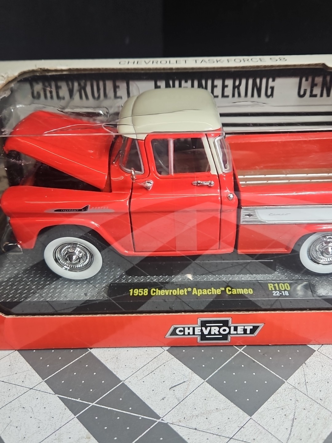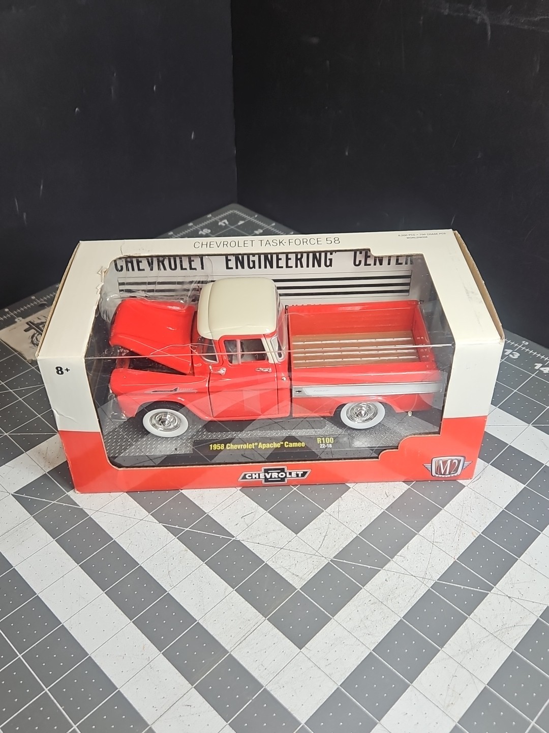 M2 Machine 1958 Chevy Apache Cameo Task Force 58 R100 22-18 1:24 LE Red NOS Box has small fracture in corner and has light wear and tears. See pictures. Product will be shipped timely and packaged with care. Offers are encouraged. Please feel free to reach out with questions. Please see pictures. Thank you. The M2 Machine 1958 Chevy Apache Cameo Task Force 58 R100 22-18 1:24 LE Red NOS is a limited edition diecast car model of the Chevrolet Apache Cameo in a red and silver color scheme. This 1:24 scale model is part of the M2 Chevrolet Task-Force series and is a special edition that comes with a case and is unopened. It is a collectible item suitable for children aged 8 and up, as well as for adult collectors. This model is a chase version, making it even more rare and sought after among collectors. Made by M2 Machines in 2022, this Chevy Apache Cameo is a must-have for car enthusiasts and collectors alike. Sku: bs2