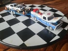 This M2 Machines Customized diecast Set is a utility Goodyear truck in blue-white is a 1:64 scale model of a 1967 Ford F-100 with a custom cab and Goodyear theme. Add-on's to it is Air Compressor With Air Hose,Tool Box,1-Gas can,Jack and 2 Jack stands, Torch set w/stand,plus Racing Decals, With Goodyear 1972 Camino Z/28 Add-on's toit Racing Decals Plus a Blue Diecast Car Hauler,Add-on's to it are 1 Spare Racing Tire and wheel, 4 Safety Cones, 2 Cable looking car tie downs,With All this Gives it a Cool one of a Kind look that is a Must have for any Diecast collectors Shelf! Makes it With It features a Chase design and was manufactured in 2019 in China. The truck is perfect for collectors and enthusiasts aged 17 years and up, and is suitable for both boys and girls.Is a Awesome Customized vehicle Goodyear model Set, is part of the Chase series. The truck also includes a trailer and is customized with the Goodyear brand. PLEASE see all photos and contact me with any questions please,The Set is a Loose set but is wrapped up good for shipping,Thanks again for looking at my Item