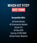 **READ** Please verify you have an M22-14mm hose prior to purchasing. The male adapters have a plug with a diameter of 14mm, not 15mm. Therefore, it is not compatible with electric pressure washers from: Sun Joe, AR Blue, Simoniz and more. If your washer requires a 15mm fitting, using this fitting will cause leaks. Compatible with all gas powered pressure washers with M22 connectors ✅ The Complete Solution: Every connector and adapter you need to convert all your connects on your pressure washer to full stainless quick connects, in one kit. ✅ Smooth Operation: The corrosion resistant stainless steel helps ensure smooth operation of the connects. ✅ Machined in Stainless Steel: Every connector is made out of 304 medical grade stainless steel, which does not rust or tarnish. ✅ Upgraded O-Rings: Made from Viton, a temperature and chemical resistant rubber compound, and much more robust than traditional o-ring materials. ✅ What's included: - M22-14mm male plugs (QTY 2) - M22-14mm female (QTY 2) - 2 male garden hose plugs (QTY 2) - 2 female garden hose QC (QTY 2) ✅ Compatibility: All gas pressure washers use standard M22-14mm hoses. Some electric pressure washers like SunJoe, AR Blue, and Active VE52 use M22-15mm hoses which will not work with this kit.