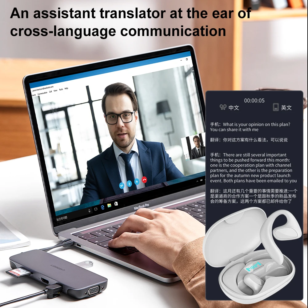 Language Translation Earbuds Bluetooth-Compatible 5.4 97% Accuracy Real-time Two-Way Earbuds 144 Languages Translation Earphones Ideal for Travel and Business Feature: 1.Efficient and Accurate Translation: translation earbuds provide bidirectional real-time translation in 144 languages, with offline translation support and a remarkable accuracy rate of up to 97%. 2.Simultaneous Interpretation: real-time translation earphones pair via Bluetooth-Compatible with your phone, offering simultaneous interpretation in touch or speaker mode once connected. 3.Crystal Clear Audio: translator earbuds deliver high-definition sound quality, ensuring clear communication and translation experiences, whether you're listening to music, taking calls, or translating languages, free from environmental noise interference. 4.Ergonomic Design: smart voice translator fits snugly within the ear, designed according to the shape of the human auricle for extended wear without discomfort, providing an immersive music-listening experience. 5.Easy to Use: translator device features charge indicators to keep track of battery status; use USB connectivity to replace charging box power for seamless operation. Specification: Origin: Mainland China Bluetooth-Compatible solution: Jerry Bluetooth-Compatible version: V5.4 Wireless frequency: 2.4GHZ Supported protocols: A2DP1.3/HFP1.6/HSP1.2/AVRCP1.6/D11.3 Transmission distance: 20 meters Battery capacity: 80mAh for earphones and 400mAh for charging case Charging voltage/current: 5V/1A Playback/talk time: about 10 hours Charging time: about 2 hours Standby time: 80 hours Speaker impedance: 16mm 32Ω Microphone sensitivity: -42Db Working temperature: -10-50℃ APP: One-click translation Packaging size: 131*93*35mm Full set weight: 150g Note: Due to different monitor settings and lighting conditions, the actual color of the item may vary slightly from the pictures. Thanks for your understanding! Please allow a 1-2 cm difference in measurements due to manual measuring. 2 X Translation Earbuds 1 X Charging Case 1 X Charging Cable 1 X Instruction Manual