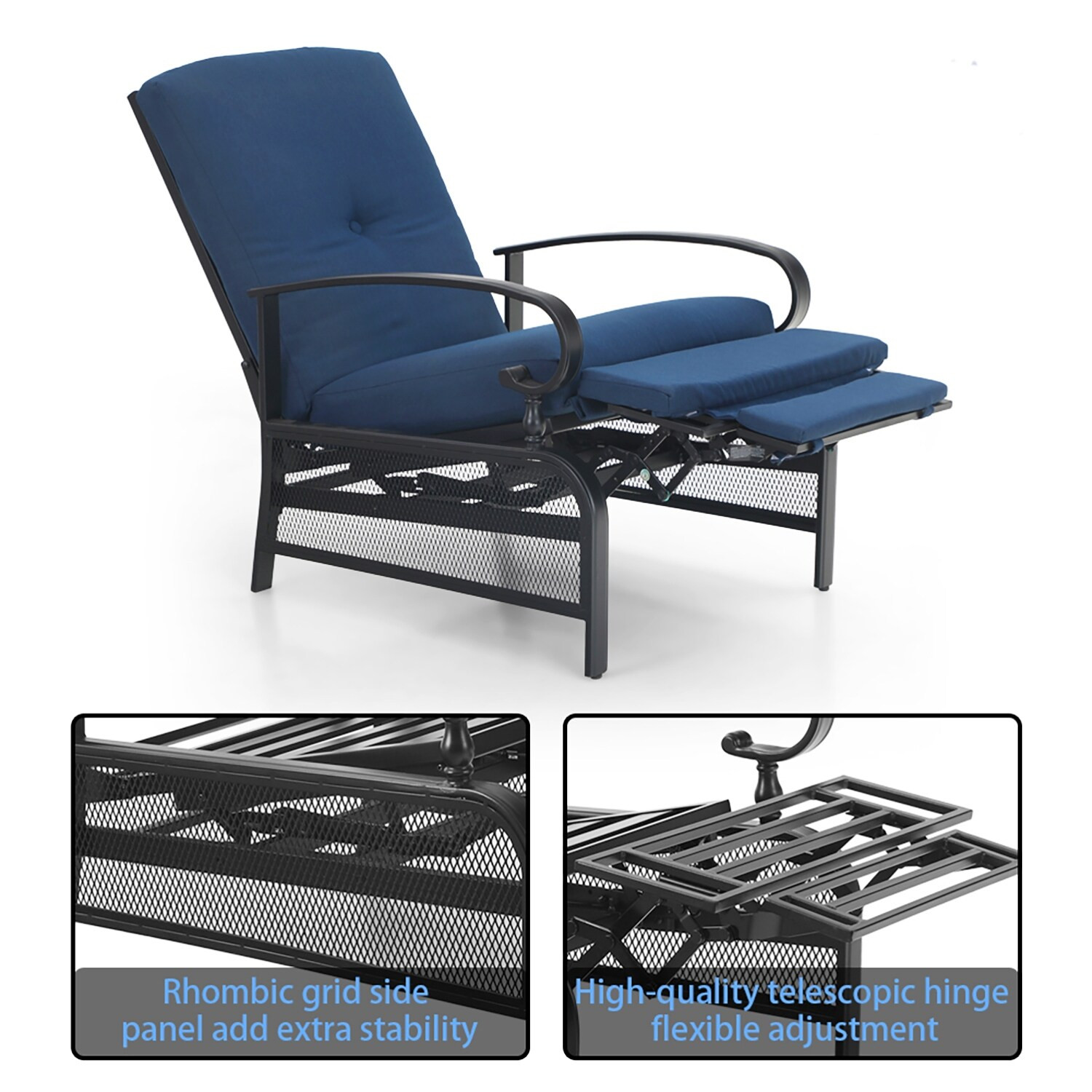 Elevate your outdoor leisure with our stylish and versatile adjustable patio recliner lounge chair. Designed for maximum comfort and durability, this recliner features a robust e-coated metal frame that withstands harsh weather conditions, ensuring long-lasting use. The plush Olefin fabric cushions provide exceptional softness and quick drying, making them both comfortable and practical. With multiple angle adjustments and an extendable footrest, you can easily find your perfect lounging position. The fade-resistant cushions not only add a touch of elegance to your patio but also resist erosion, maintaining their look and feel over time. Available in a variety of colors to complement any patio decor, this recliner is the perfect addition to your outdoor space, offering both style and Free Shipping Over $49.99* Details MAISON ARTS Adjustable Recliner Lounge Chair & Bistro Table Set - Perfect for Product Description: Elevate your outdoor leisure with our stylish and versatile adjustable patio recliner lounge chair. Designed for maximum comfort and durability, this recliner features a robust e-coated metal frame that withstands harsh weather conditions, ensuring long-lasting use. The plush Olefin fabric cushions provide exceptional softness and quick drying, making them both comfortable and practical. With multiple angle adjustments and an extendable footrest, you can easily find your perfect lounging position. The fade-resistant cushions not only add a touch of elegance to your patio but also resist erosion, maintaining their look and feel over time. Available in a variety of colors to complement any patio decor, this recliner is the perfect addition to your outdoor space, offering both style and comfort for your relaxation needs. Highlights: Exceptional Comfort: Enjoy wide, deep seats with flexible backrests and footrests, enhanced by thick, plush cushions for a superior seating experience. Durable Outdoor Design: Built with a weather-resistant, rust-resistant steel frame and high-performance e-coating. Ergonomically designed for long-lasting comfort and durability. Luxurious Cushions: Made with Olefin fabric and high-quality sponge, our cushions are soft, quick-drying, and fade-resistant, providing a cozy and durable seating experience. Effortless Operation: Recline easily by gently pushing the back without the need for levers or buttons. Supports up to 300 lbs, ensuring smooth and relaxing use. Versatile Use: Ideal for various outdoor settings such as porches, poolside, decks, or gardens. Perfect for lounging, reading, or enjoying a drink in comfort. Stable and Stylish: The metal steel frame and e-coating offer longevity and rust resistance, making this recliner and table set a stable and stylish addition to any outdoor space. Additional Details: Weight capacity300 pounds Chair weight63.9 pounds Cushion thickness3.54 inches Tables are available in two sizes with an optional umbrella hole The set includes 2 lounge chairs and 1 side table or 1 lounge chair