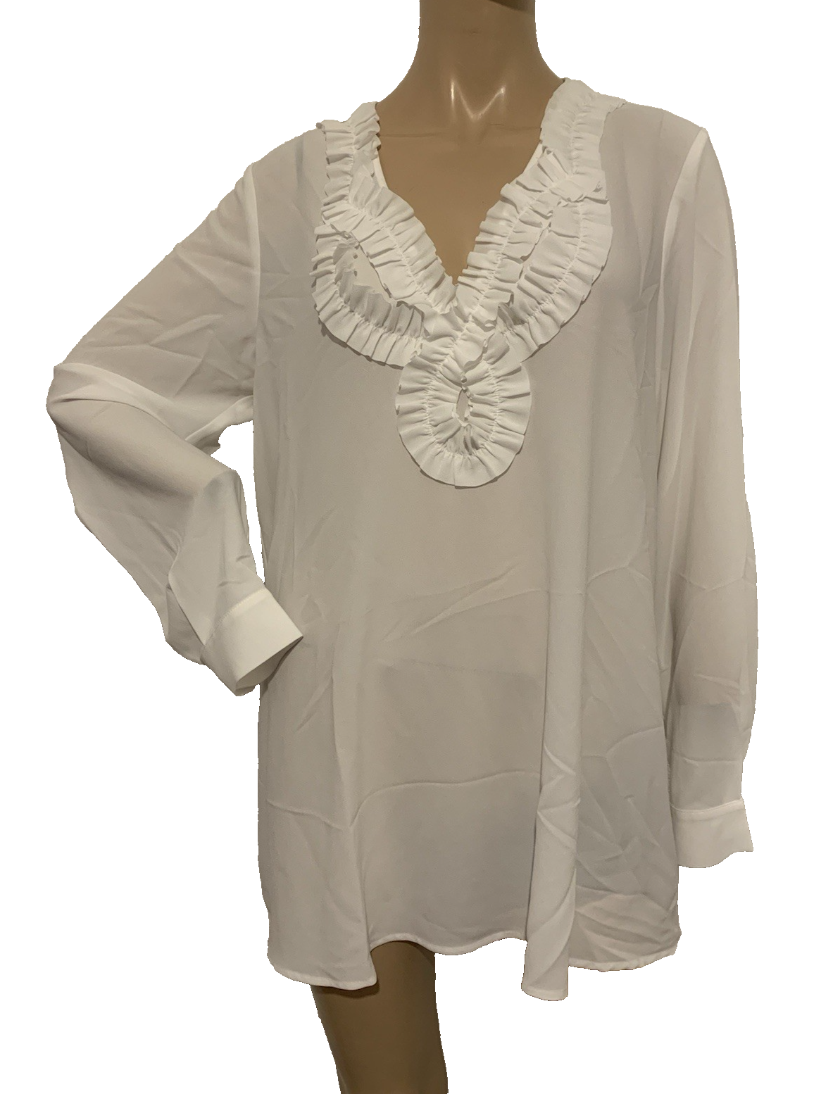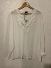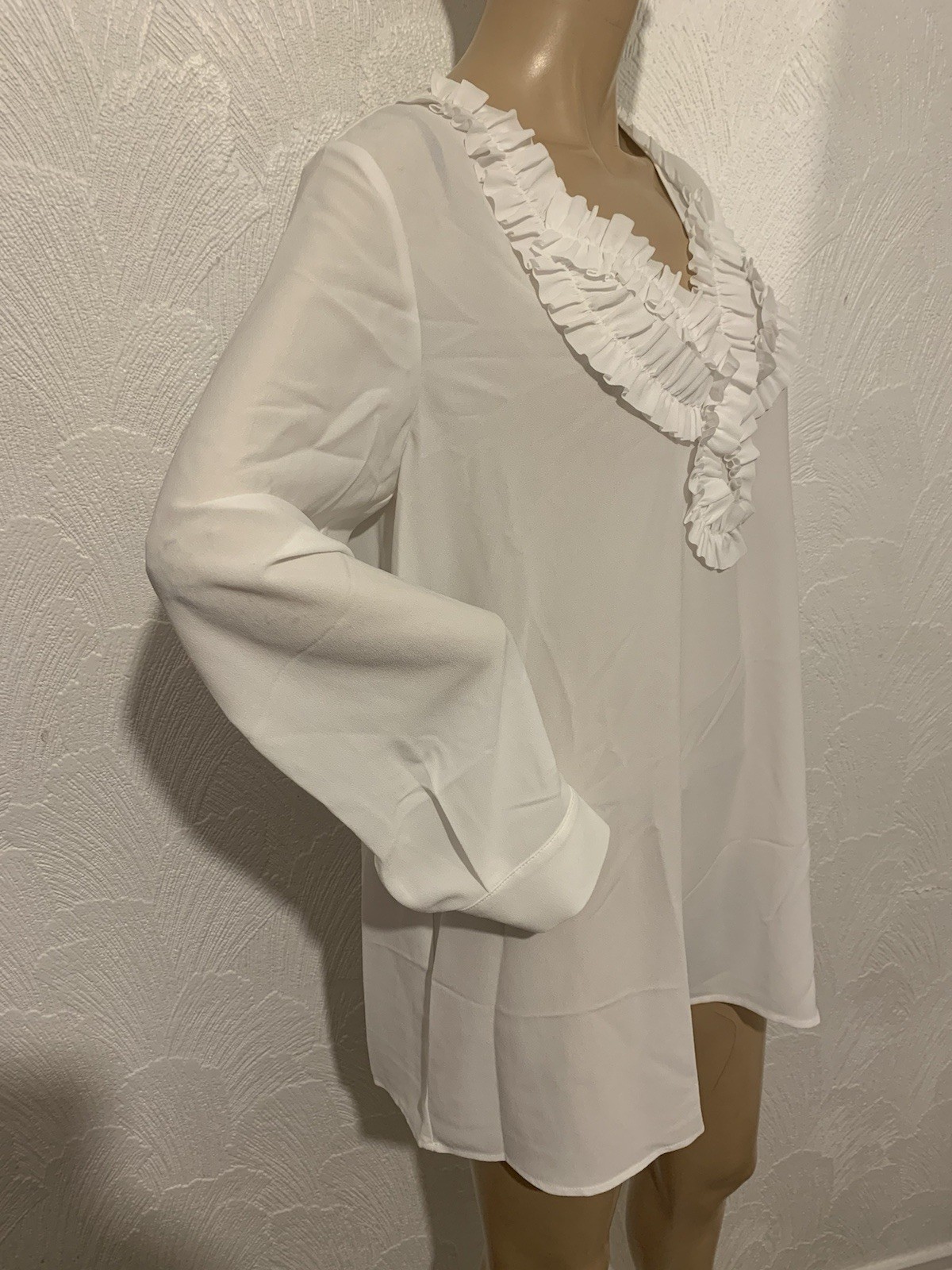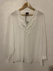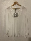 PERSONA By MARINA RINALDI 'Falco' white sheer long sleeved blouse with ruffle neckline. Perfect for parties, special occasions, work, business, casual wear and holidays. Classic wardrobe staple. Such a lovely, versatile and chic blouse, can be dressed up or down. Superb quality and fit from an Italian luxury brand. Completely sold out. Lightweight non-stretch sheer fabric Regular fit Slips on 100% polyester Hand wash Size: 19 - UK 14, US 10, FR 44, IT 48 - S - Brand sizing. Bust 42 inches Length 29.5 inches Sleeve length 24.5 inches True to size Modelled on a UK 8 with 32 inch bust Brand new with tags Please check all photos for condition and fit, read the description and compare accurate measurements I have written above with your own before purchasing to ensure satisfaction as I do not offer refunds. Will be sent with tracking