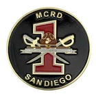This 2" challenge coin commemorates the Marine Corps Recruit Depot (MCRD) in San Diego, specifically Charlie Company's 1st recruit. The coin is a collectible item representing current military memorabilia and belongs to the category of challenge coins and militaria.
