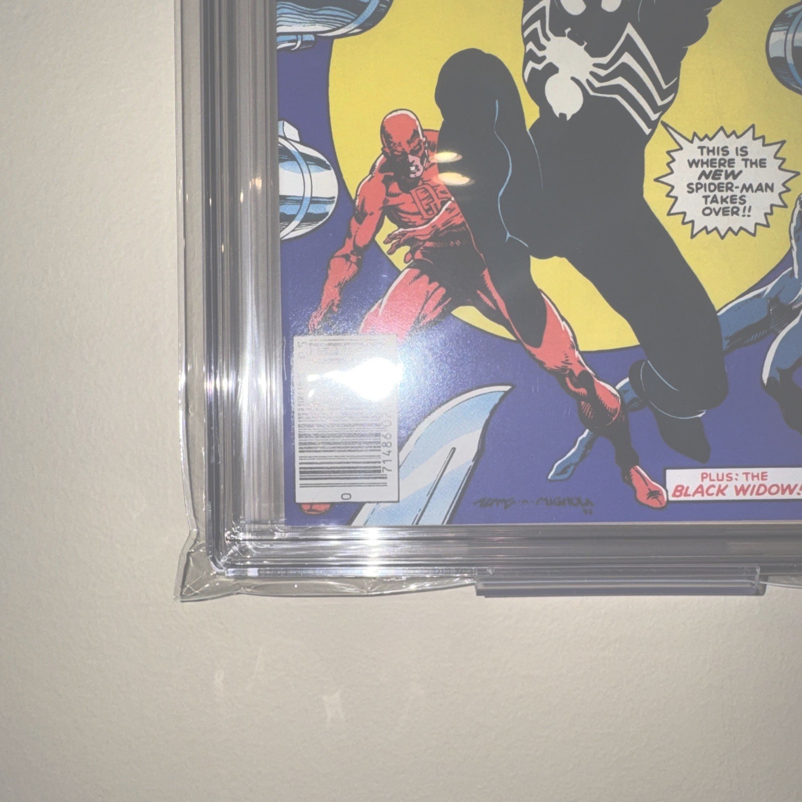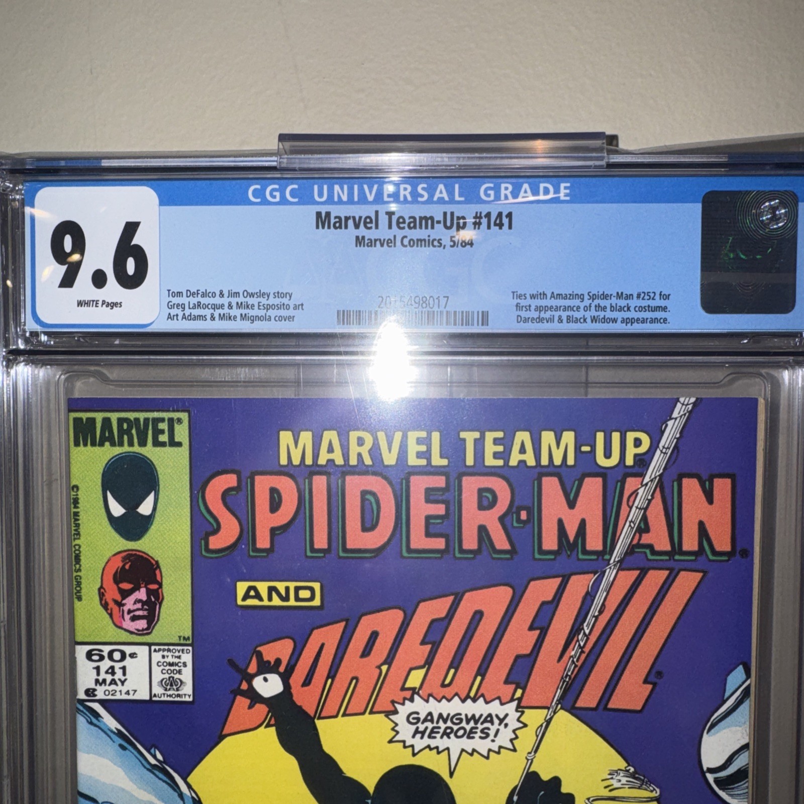 Marvel Team-Up #141 CGC 9.6 NEWSSTAND 1984 – May First appearance of the black costume symbiote. The real deal. Not the direct edition. Off-white pages, spine stress zero, slab flawless. Recently 9.6 newsstands are selling around $600 $525 Buy-It-Now Best offer accepted.
