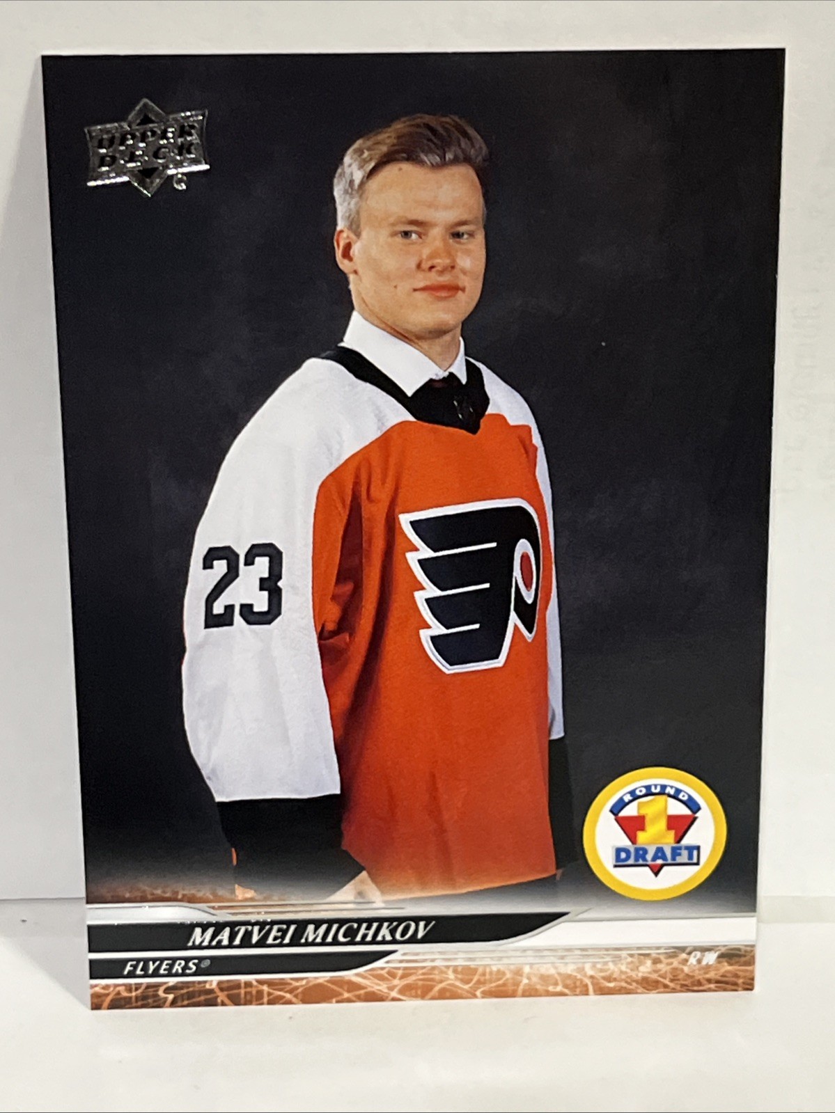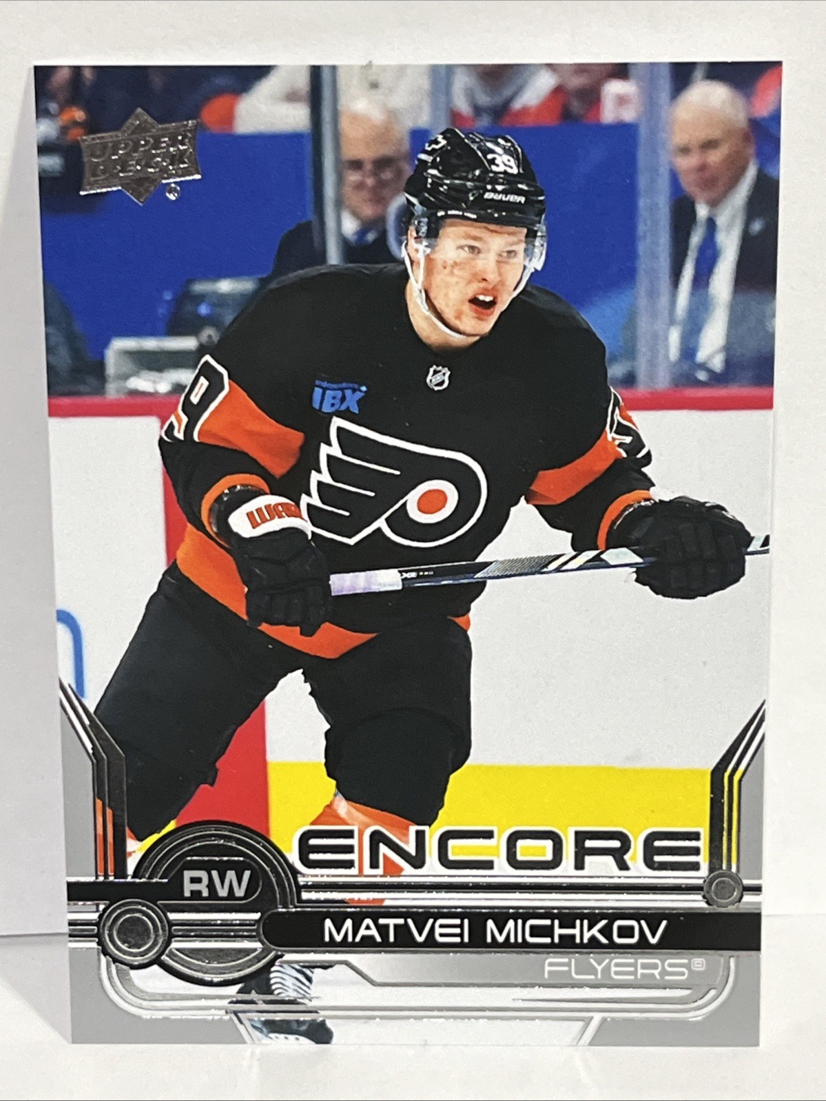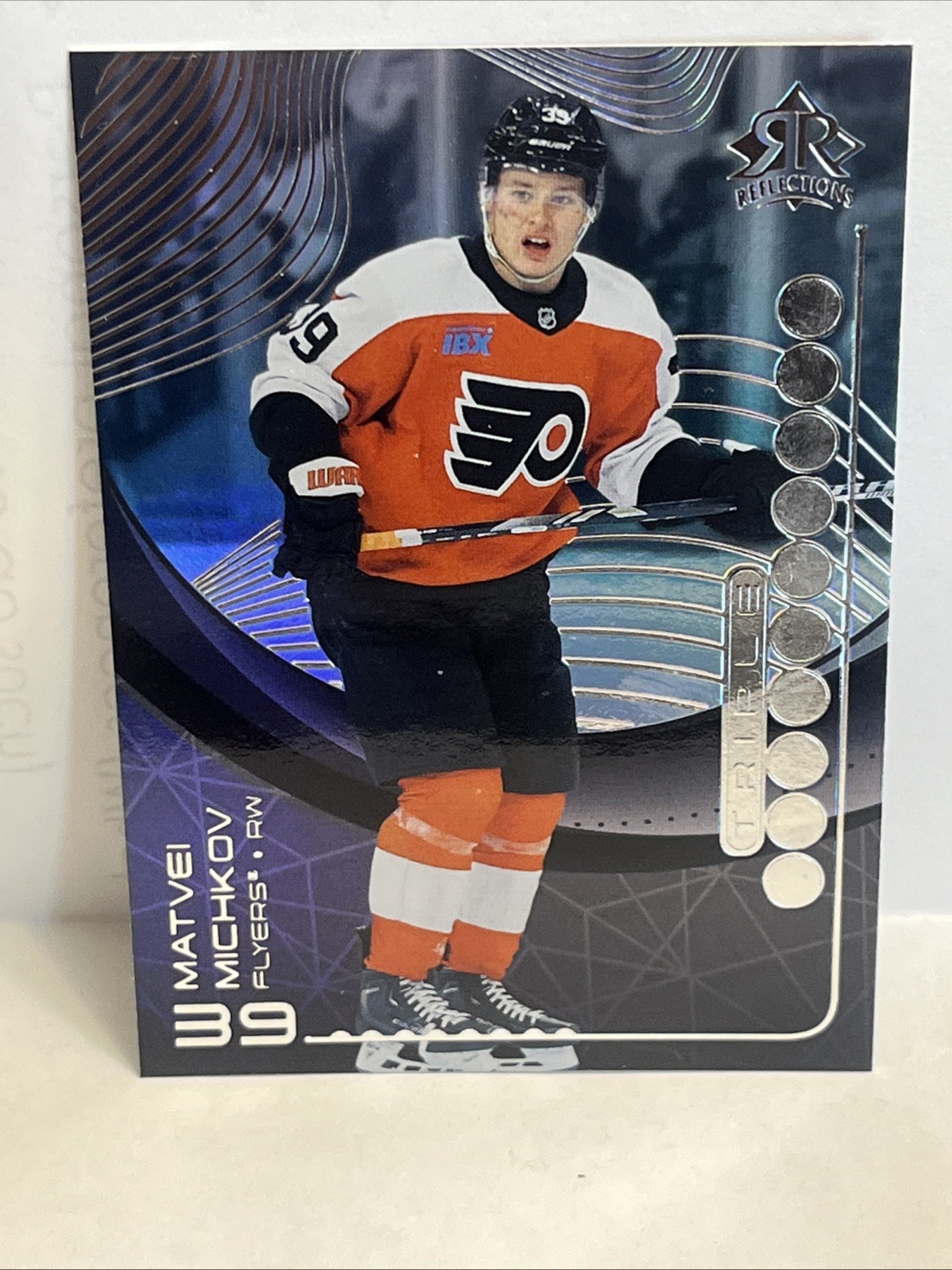 Step into the world of ice hockey with this exclusive lot of 9 Matvei Michkov cards from the 2024-25 Upper Deck Series. Each card showcases the Philadelphia Flyers' rising star in stunning detail, capturing the essence of the Stanley Cup Finals. The cards, feature the 'Insert' parallel variety, adding a unique element to your collection, these cards are a treasure for any enthusiast or fan of the National Hockey League. They come in standard card size with a 35 Pt. thickness, ensuring a durable addition to your sports memorabilia. While not autographed, each card's authenticity is guaranteed by Upper Deck, making it an original piece of hockey history. Selling 9 cards as is condition, no return or refund for any reason whatsoever. All sales are final. Only cards that are seen in the main picture and listed below are included with this set. Set includes: Trilogy Level 1-# 139/999 Welcome Aboard YGs Check list( see picture card #500) On Tour Insert Beehive Round 1 Draft card Rookie Reflections Future Impact Silver Skates Encore Triple Dimensions(1 regular) All 9 cards to be shipped out with tracking and in penny sleeves and with team bags and bubble mailers. No return or refund for any reason whatsoever. All sales are final.