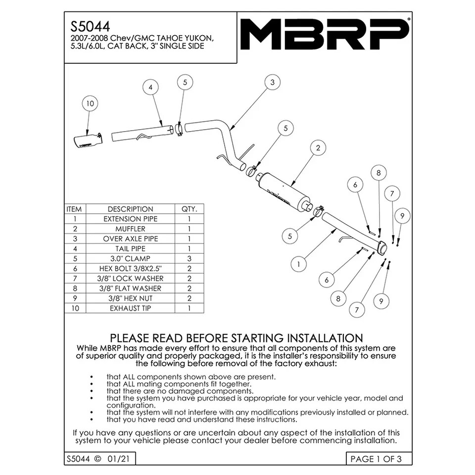 MBRP 3" Cat-Back Exhaust System w/ 4" Polished Tip For: 2007-2008 Chevy Tahoe / GMC Yukon 5.3L V8 Details: 3" Aluminized Steel 4" Polished Exhaust Tip Welded On Hangers Increases Horsepower & Torque Can Improve Fuel Economy by 1-2 MPG 3 Year Warranty Built to Perform MBRP's performance exhaust systems are built to perform. Designed to maximize exhaust flow and minimize exhaust temperatures your truck will use less gas, last longer and perform better. Every system we sell has been built to the most exacting standards in the industry. Dyno Proven Your MBRP performance gas exhaust system has undergone countless hours on our in-house Mustang 1100 AWD-SE Chassis Dynamometer, hundreds of miles on road and track and numerous tweaks and modifications to get the most out of your truck. From the vehicle specific muffler design to the fully mandrel bent tubing to minimal bend degree angles, your MBRP performance system gets exhaust out fast. An MBRP performance exhaust system is the starting point to getting the most from cold air intakes, programmers, modules and downloaders. Easy Installation MBRP systems are as much fun to install as to drive with on your truck. Bolt-on, no weld design makes installation a no hassle one and a half to two hour project. Everything is direct fit to the OEM hangers and you get all the clamps and parts you will need. Sound & Style Performance is one thing but at MBRP we believe that appearance and sound are just as important. Every MBRP performance exhaust system has been specifically tuned to get the optimal sound from your pickup. With our stamped logo on the tip and our unmistakable styling, there's no question that you have the hottest performance exhaust on the road - MBRP.