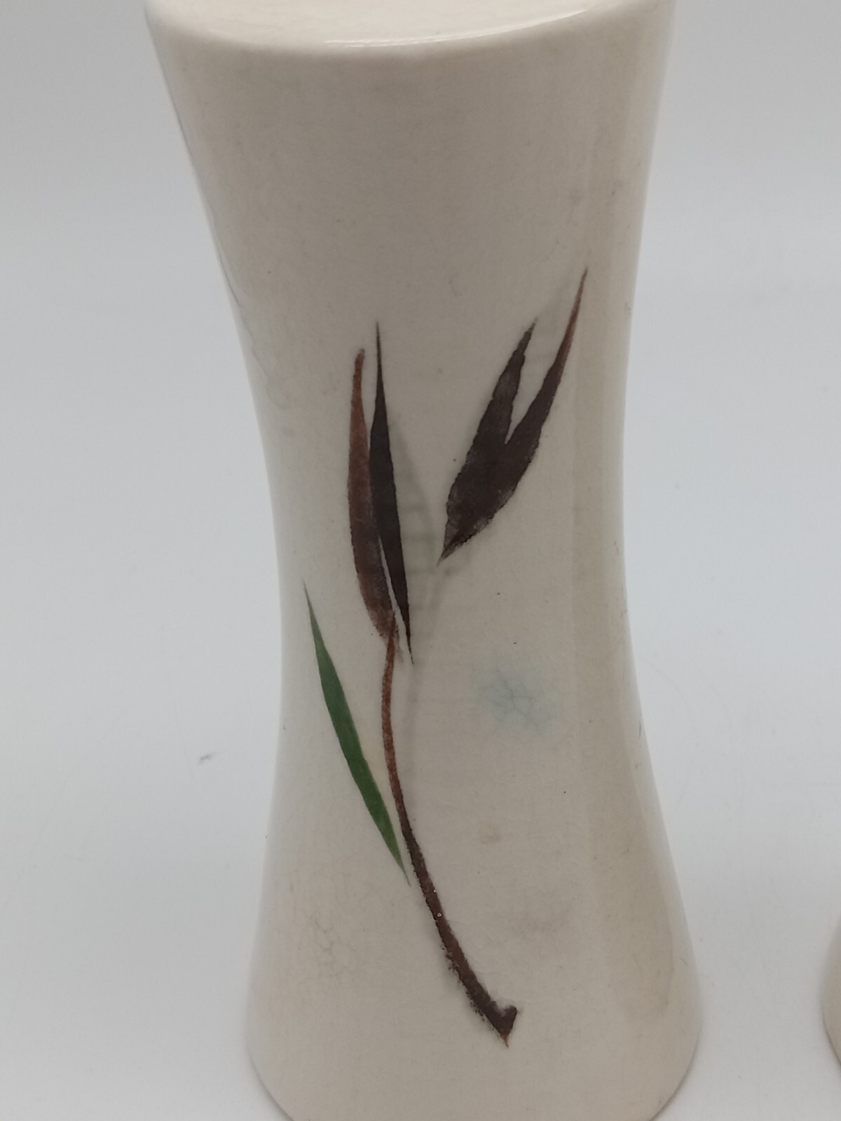 Spice up your kitchen with these charming MCM hand-painted salt and pepper shakers. The set includes both a pepper shaker and a salt shaker, making it a versatile addition to your spice collection. The tapered shape and 1960s style make these shakers a must-have for any vintage kitchen enthusiast. Made in Japan,