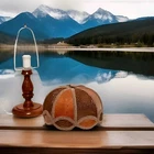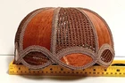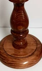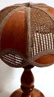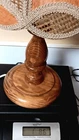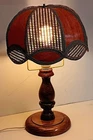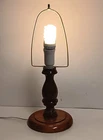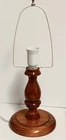 Vintage Mid-Century Modern Solid Honey Oak 15.5" Base Candlestick Design Lamp & Bohemian Rattan With Faux Thin Oak Panels 10" Lace Accent Lamp Shade. Gently pre-loved, good, clean, working condition. Missing the original finial. The lamp may have been rewired at some point prior to me owning it. It has writing on the bottom base from the previous owner, but it does not affect the origin of the piece. Unsure of the exact manufacturer or year. This lamp is absolutely stunning! I will ship with extra padding to ensure the integrity of the lamp. See photos.