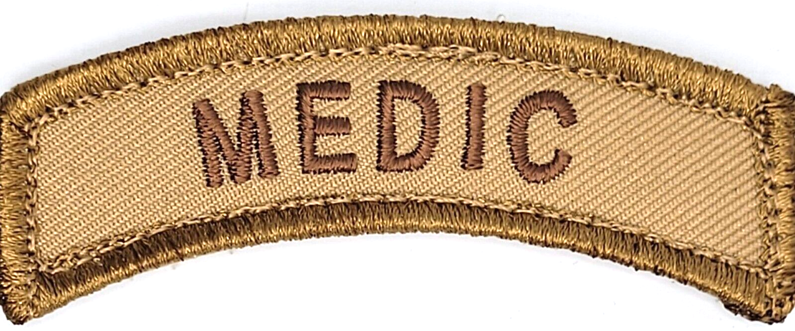 MEDIC Embroidered Tab Arc Tactical Patch desert tan and brown APPROX. 2.5" X .75" ARC SHAPE EMBROIDERED TACTICAL HOOK PATCH Tactical patch fully embroidered for backpacks, clothes, caps, bags and military uniforms. Hook backing