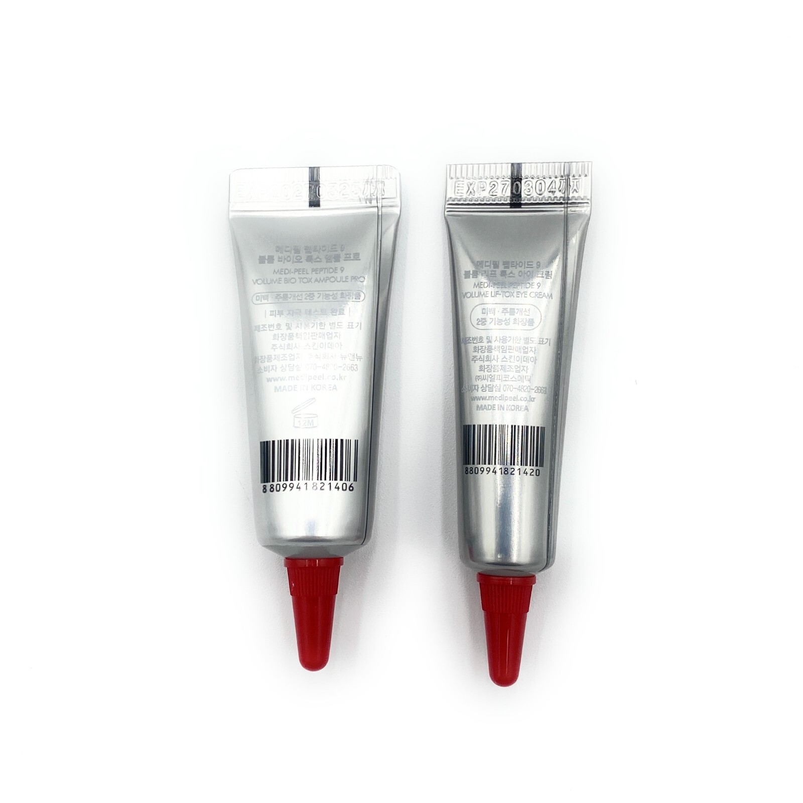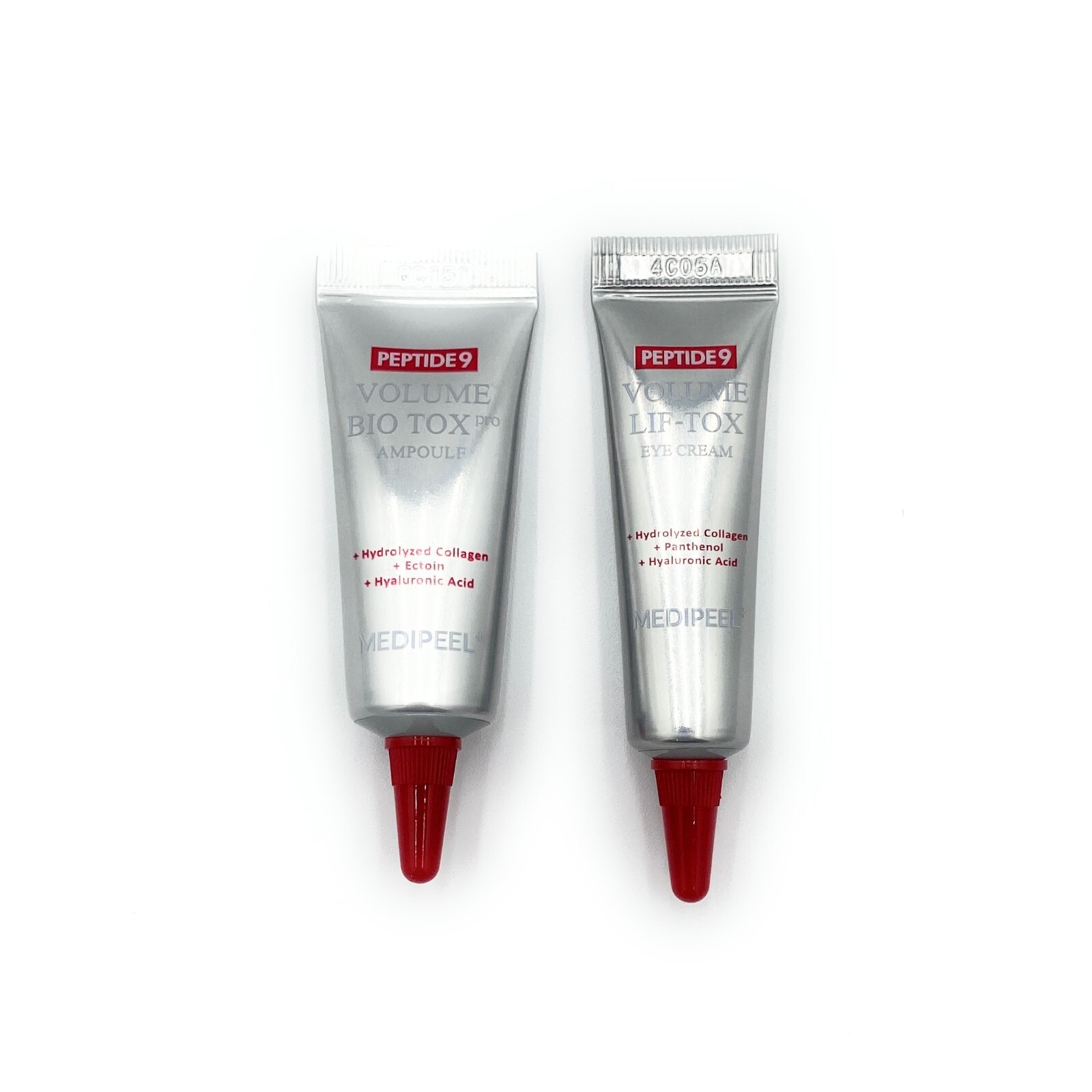 Enhance skin elasticity and firmness with MEDI-PEEL's Peptide 9 Volume Bio Tox Trial Kit. This powerful line combines 9 types of Peptides and Anemarrhena Asphodeloides Root Extract to provide hydration, volume, and nourishment. Its compact size makes it perfect for on-the-go skincare. Peptide 9 Volume Bio Tox Toner Pro: Contains Collagen, Elastin and Hyaluronic Acid to help promote healthy-looking and youthful skin. Refreshing water texture allows fast absorption and leaves a non-sticky finish. 20ml Peptide 9 Volume Bio Tox Ampoule Pro: This ampoule is formulated with vitamin C-rich astaxanthin to improve the appearance of dull skin while the 9 peptides enhance skin elasticity. Provides a burst of hydration to the skin with 9 types of Hyaluronic Acid.10ml Peptide 9 Volume Lif-Tox Eye Cream: An eye cream that takes care of wrinkles around the eyes. Provides rich nutrition to wrinkled and drooping eyes, laugh lines, and forehead wrinkle care. 4ml Peptide 9 Volume & Tension Tox Cream Pro: It saturates the skin with beneficial components 2 times faster and provides a lifting effect. A balanced tandem of anti-aging assets restores elasticity, increases firmness, smoothes wrinkles, and strengthens the oval of the face. 10g How to use: After cleansing, apply a moderate amount of the toner, ampoule, eye cream and cream accordingly. Pat gently for better absorption.