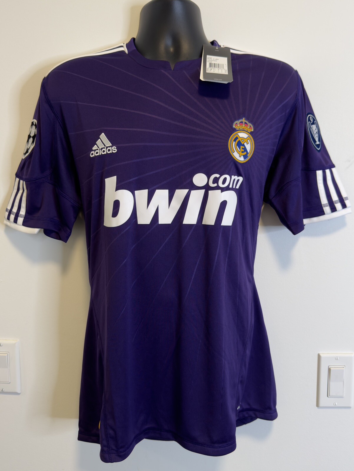 MEDIUM BNWT Real Madrid 2010/11 Third Jersey Shirt 10/11 3rd Top Kit Ronaldo Era. Dispatched via Canada Post. Authentic Real Madrid FC X Adidas product. Product code: P95678 Brand new with tags condition. No stains, holes, marks or other blemishes on the fabric. The shirt has been stored out of direct sunlight to avoid any heat related damage. Shirt sponsor (bwin) is in perfect condition with no peeling, cracking or lifting. Adult size Medium (M). Pit-to-pit measurement is approximately 21 inches. Shoulder-to-hem measurement is approximately 30.5 inches. Official Champions League Star Ball patch on right sleeve. Official Champions League Trophy (9 times winners) patch on the left sleeve. The patches are the official flock material and have been professionally applied. They show no peeling or other signs of wear. All pictures are my own and are of the exact shirt you will receive. All available items ship from a pet-free and smoke-free environment. All purchases will be packed securely and shipped the next working day.