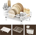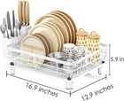 Drain Directly into the Sink: You can move it up to the sink with the spout extended so that no more water on the countertop while you are washing or putting items in Save Space: It takes up minimal counter space, you can do all the dishes in one sweep instead of stopping halfway to dry and make room for more Easy to Assemble: Packed with racks, water collector tray, utensil holder, knife slot, and drainage board feet, only took 5 minutes or less to get it all put together, no extra tools needed Suited to Smaller Households: It suffices for a quick washing and draining of breakfast, lunch or dinner plates, cups, spoons, forks, knives, and bowls for family of three Sturdy and Convenient: Dimensions 16.9" D x 12.9" W x 4.9" H, simplistic design, easy cleaning, functional and useful to organize cleaned dishes in the kitchen