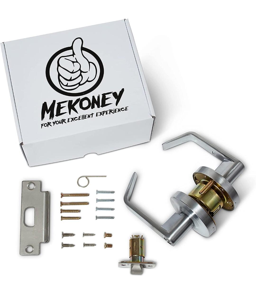 MEKONEY Privacy Door Lock Heavy Duty Cylindrical Lever Lock set #D2. HIGH SECURITY LOCK: Our commercial door handle is equipped for low, mid, and high level security! For low level security, install normally, for mid level, install with the provided support screws, and for high, install with thru bolts! Installation is a breeze with the installation instructions we include for each option! Our high precision lock is a PICK RESISTANT 6-pin tumbler solid brass cylinder! You'll be able to rest easy knowing this high quality ADA door handle is protecting your home! SMART DESIGN: Each of our commercial door locks is designed with a FreeWheeling clutch design to prevent damage from trying to open the handle when locked. Each of our commercial door knobs has been designed for a specific privacy lock function! The lever can be operated from either side, but is locked from the inside by a push button inside! The inside lever is always unlocked to provide a safe emergency exit if needed. This door lever with lock is especially perfect for bedrooms and bathrooms! ADA CERTIFIED: This ANSI Grade 2 industrial door handle meets all ADA requirements! It is a 4500 series commercial lock designed for durability, privacy, and safety. The DIMENSIONS of our commercial door handles are 4.5 inches (handle length) x 3.3 inches (base length) x 2 inches (distance away from the wall). Our industrial handle is specially designed for barrier free application, for easy installation in most doors! Each heavy duty handle is designed for right or left handed people! SLEEK METAL LOOK: Our metal door lock has industrial stainless steel features that give it a sleek professional look! It will go beautifully with any door color you have! We've even designed this commercial door knob with a mount that conceals the screws! Give your home entry, bedroom door, or any entrance a polished and modern feel! Our satin chrome finish is the perfect final touch for your door! Give your home protection that will help you sleep at night while matching your interior design! Track Page Views With Auctiva's Counter