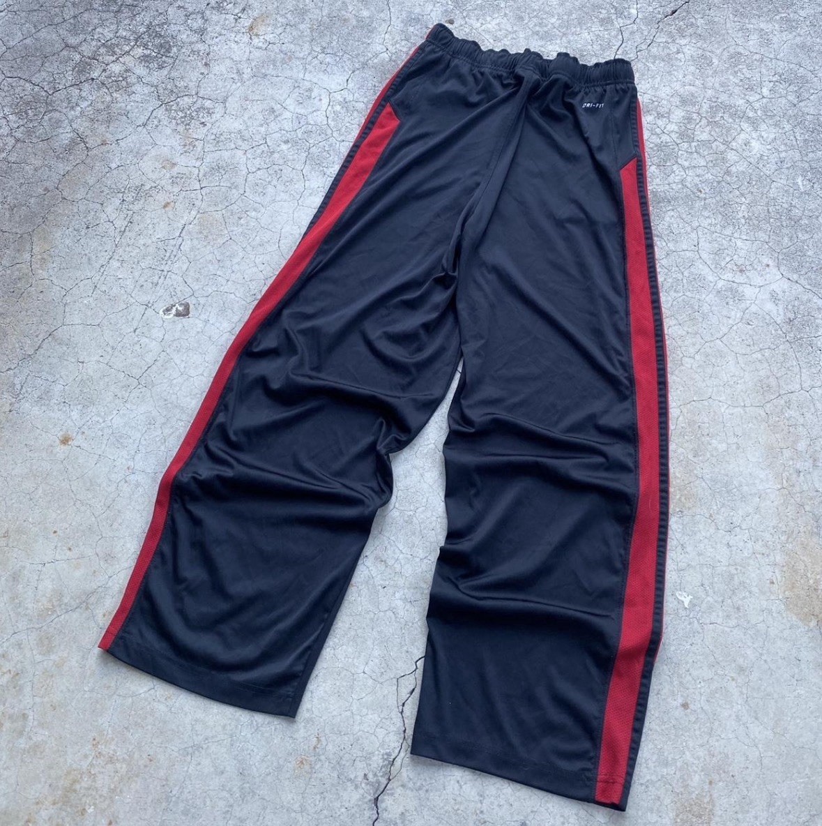 Black Nike tracksuit pants with a red stripe. Between small and medium size.