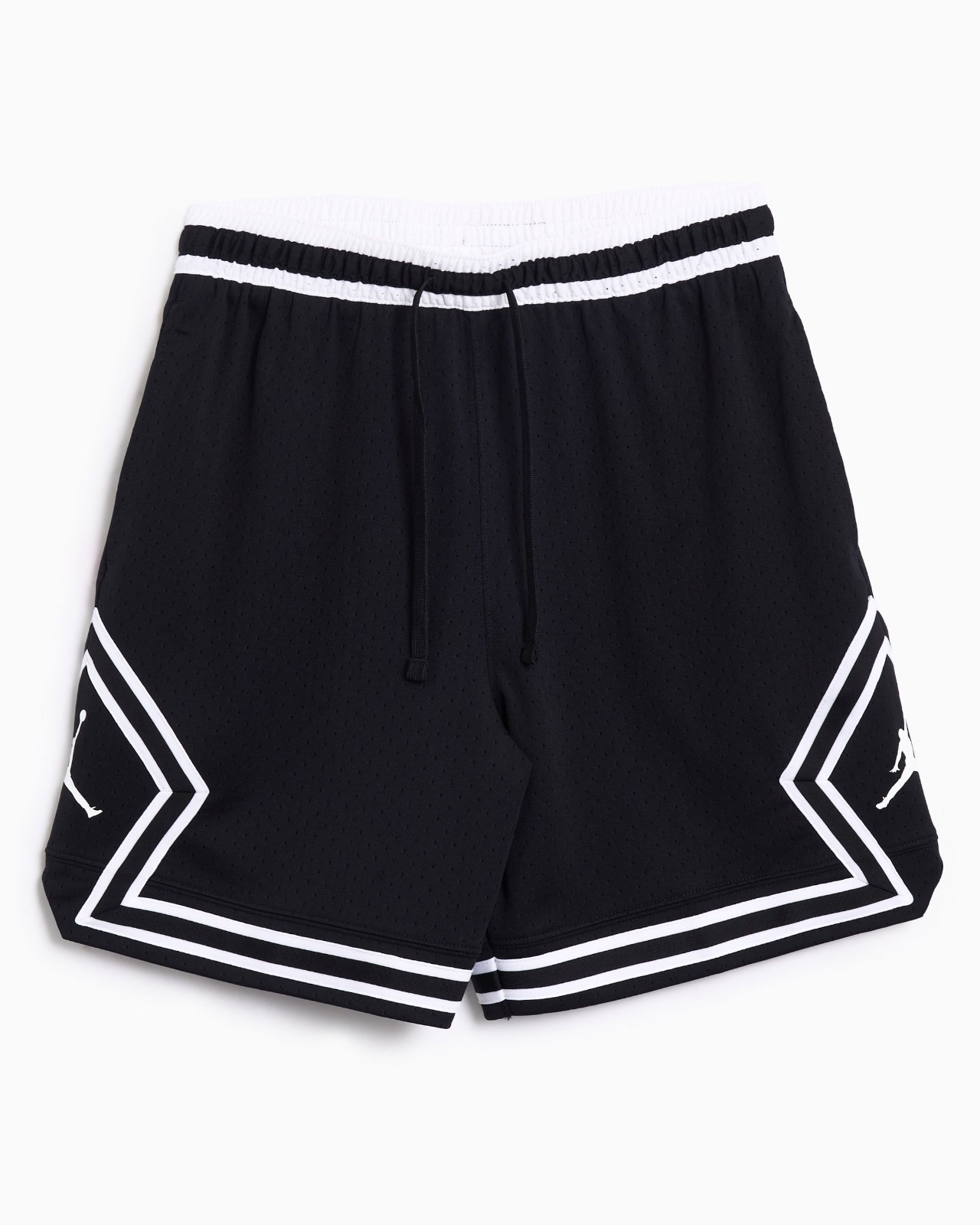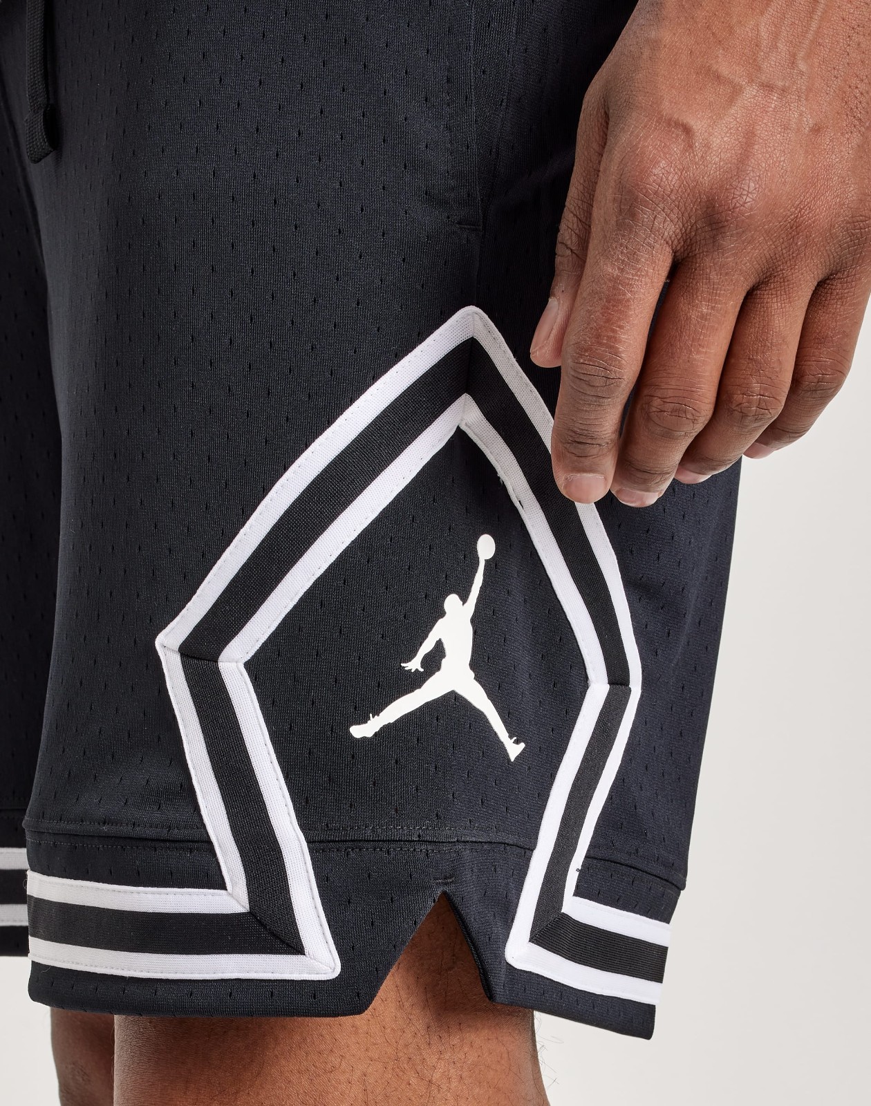The product is a pair of Men's Jordan Sport Dri-Fit Mesh Diamond Shorts in black and white. These athletic shorts feature a stylish argyle/diamond pattern with the iconic Jordan brand logo. Made of polyester mesh fabric, they are designed for active occasions with an elastic waist and drawstring closure for a comfortable fit. Perfect for sports-themed wear in size 2XL, these shorts are ideal for winter seasons and embody the sporty character of Michael Jordan. Nike Air Jordan Jordan