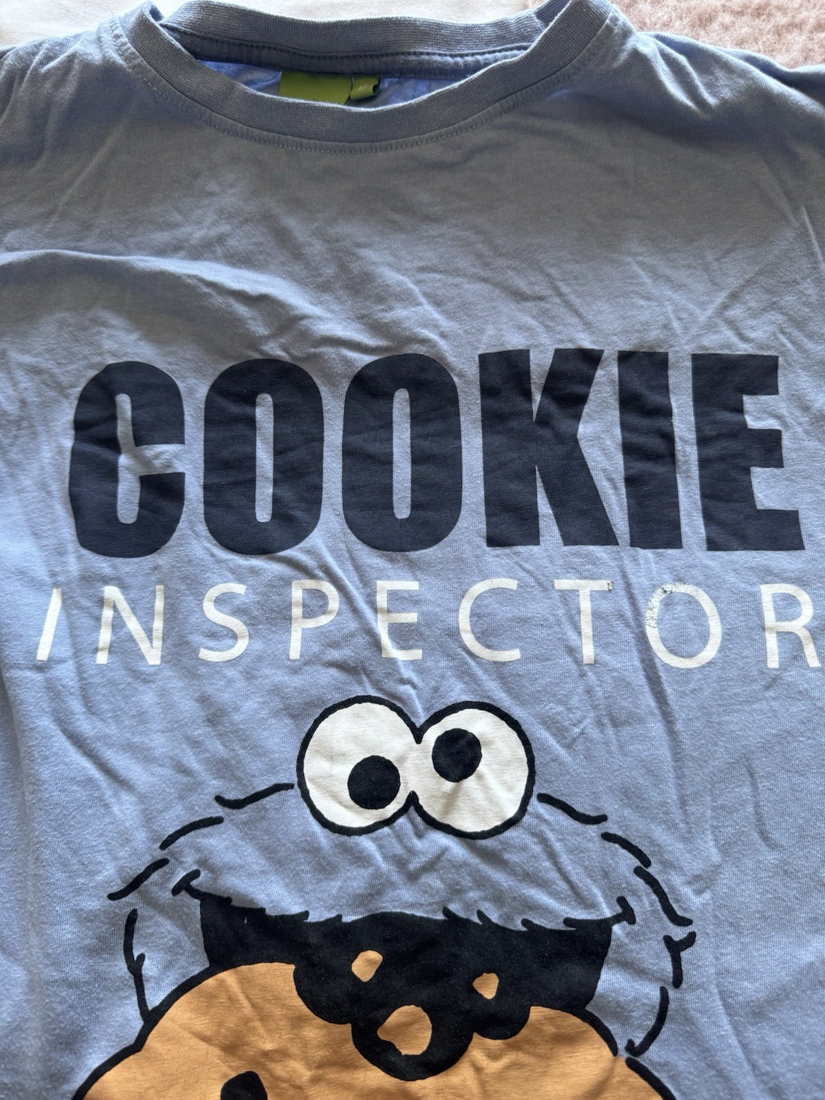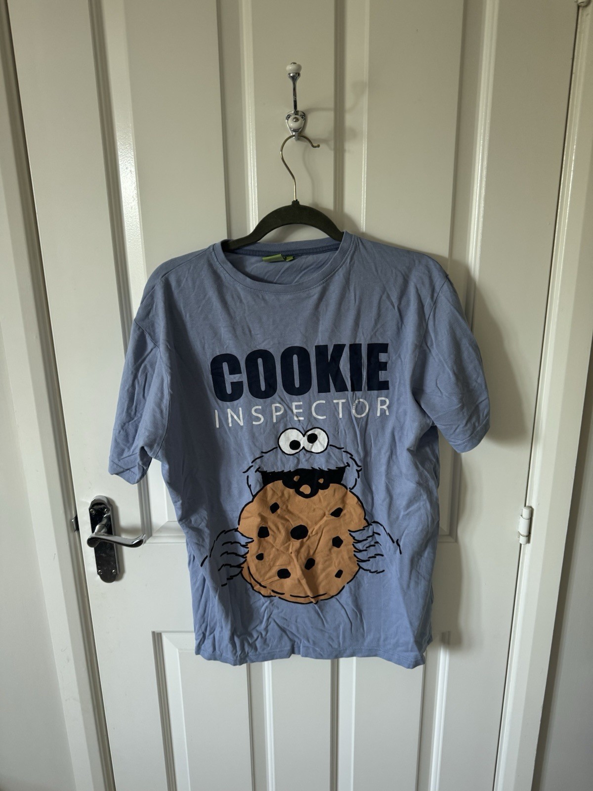 This men's novelty T-shirt in size medium features a graphic print of the Sesame Street Cookie Monster in a blue and black colour scheme. The slim-fit shirt has a crew neckline, long sleeves, and is made from machine-washable cotton material. With accents of the Sesame Street logo, this T-shirt is perfect for fans of the popular children's show and is suitable for wearing throughout the seasons. Ideal for those with a sense of humour or for a fun Halloween costume.
