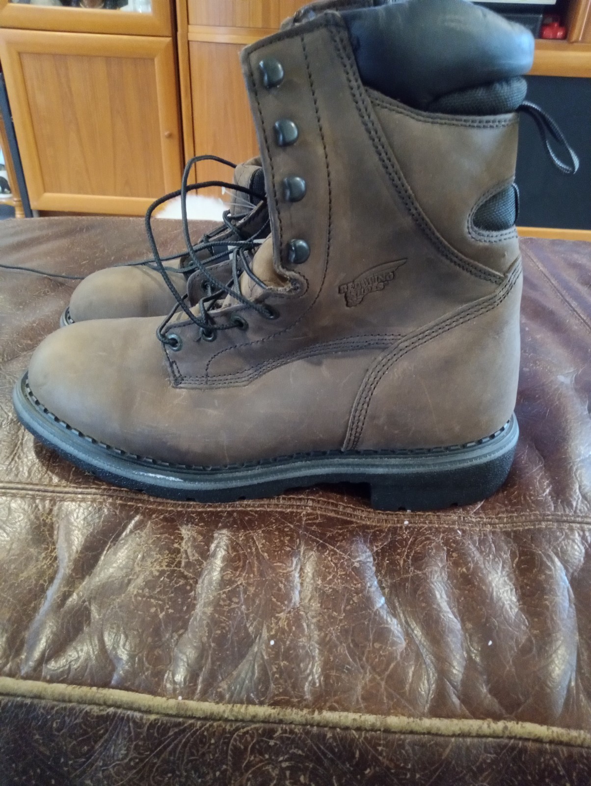 This product is a brand new pair of Red Wing Men's 10" boots in size 10, without the original box. These lace-up boots feature a round toe shape and mid-calf shaft style, made of leather with a fabric lining. They are designed for workwear, travel, and casual occasions, with waterproof and oil-resistant features. The boots are insulated and suitable for all seasons, with a strong leather outsole and a foam insole for added comfort. Made in the United States, these boots embody a rugged USA-themed style that offers both durability and style for the modern man.: READ THE TONGUES ARE BENT OVER BECAUSE OF THE WAY THEY WERE STORED, BRAND NEW, NO BOX, NEVER WORN!! VERY NICE