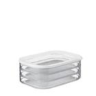 The cold meat storage container Modula 550/3 is suitable for storing different meat products in one box. The kitchen storage container consists of 3 different compartments that are stackable. So, you can store meat slices of sausage, chicken, bacon and salami separately in the fridge organiser. The container for food features a sealing ring which ensures perfect seal, making this kitchen organizer suitable for storing various meat products. The rectangular Modula meat boxes with rounded corners have a capacity of 1650 ml. In addition, the ham holders & bacon containers from are transparent and have a clear lid. This gives instant visibility of contents, even in the fridge. It is good to know that the Modula containers of are available in different sizes and colors. Also, like all storage boxes, the Modula meat cuts container is food-safe, 100% BPA-free, stackable and dishwasher-safe. No matter how demanding you are: Modula storage boxes are up to it! VERSATILE FOOD STORAGE: The Modula is your ideal solution for storing a wide range of meats, including salami, turkey, chicken, and various cheese cuts. Keep your kitchen organized effortlessly with this set of 3 storage boxes. AIRTIGHT: Seal in freshness with confidence. Our airtight lid ensures your meats and cheeses are stored properly, for you and your family to enjoy. EFFORTLESS CLEANUP: Enjoy the convenience of easy cleaning as these containers are dishwasher-safe, saving you time and effort. STYLISH AND FUNCTIONAL: We designed these containers to craft a frame-like appearance for the ingredients. When viewed from the top, each container elegantly frames the contents, achieving an artistic aesthetic while also allowing for easy identification of contents. SUSTAINABLE & SAFE CHOICE: Made in Holland, these BPA-free containers are the smart choice. Durable and long-lasting, they're an investment in sustainable living, reducing the need for frequent replacements.