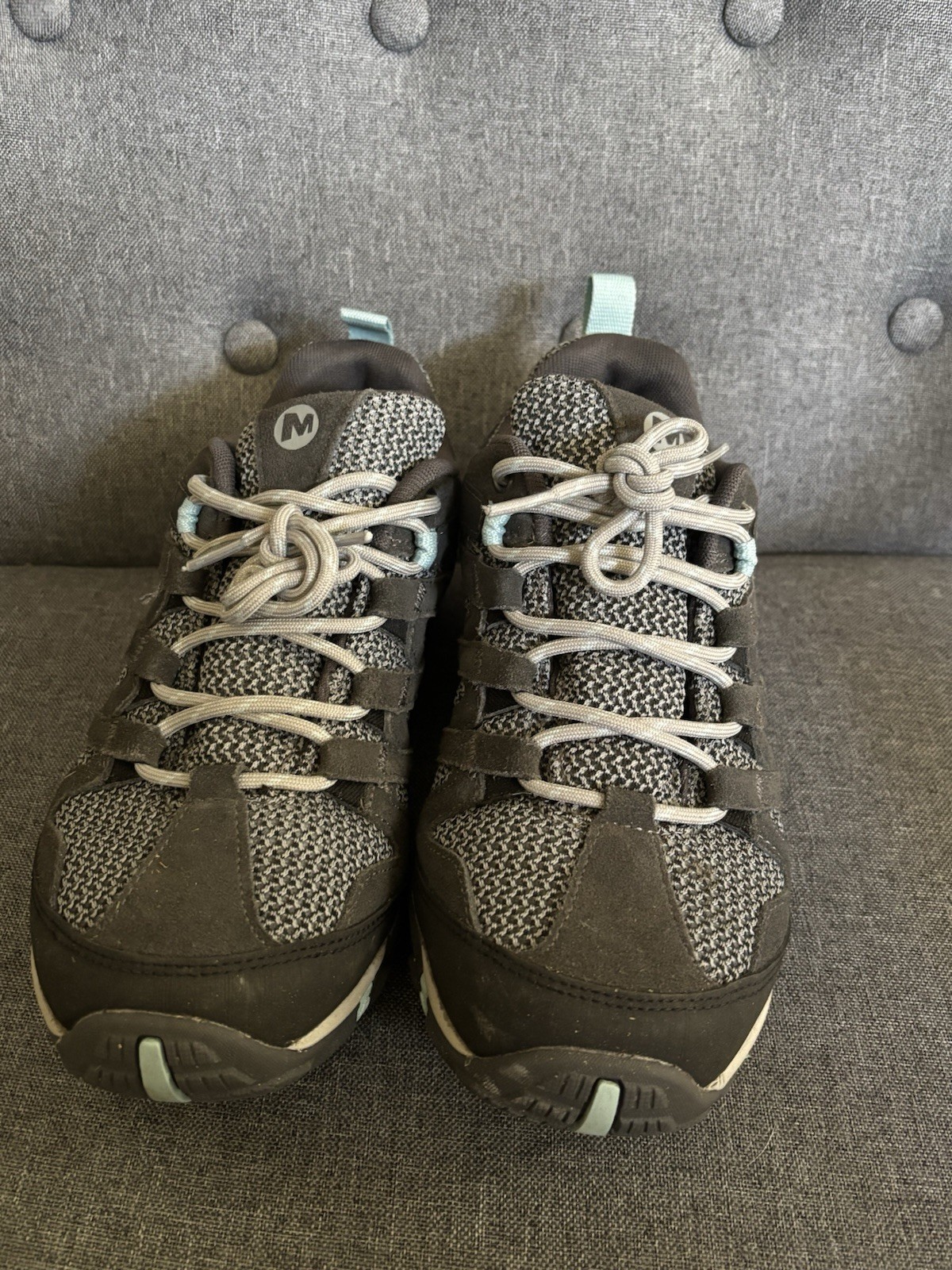 Very nice pair of women’s size 9 Merrell Storm hiking shoes. Very gently used, in great condition! Has a small stain on top of left shoe (see photos). Might be able to be removed.
