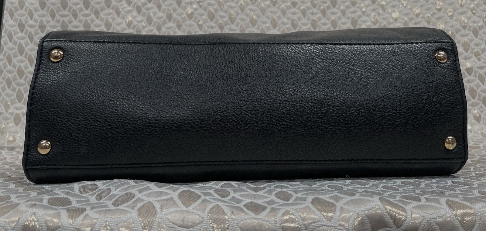 Elevate your style with this Michael Kors Hamilton black leather large handbag. This elegant satchel/top handle bag features a pebbled finish and buckle, studded, and zipper accents. The bag has a zip and snap closure and a gold-plated hardware. It comes with a chain strap for easy carrying and is perfect for various occasions such as travel, party/cocktail, casual, workwear, and business.The bag has a spacious interior with inner pockets, dividers, and a lined polyester, nylon, cotton, and fabric lining. It also has bottom studs for added protection. The Michael Kors Hamilton bag is a classic designer bag with a solid pattern and a black lining color. Get this stylish bag to complete your outfit and make a statement.