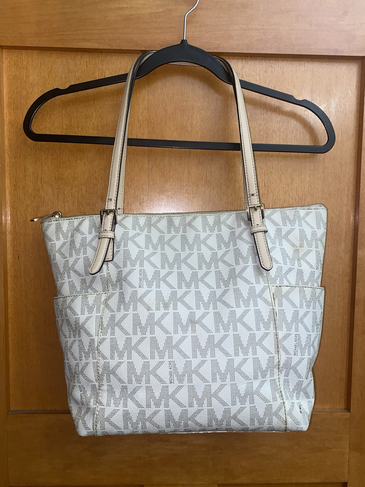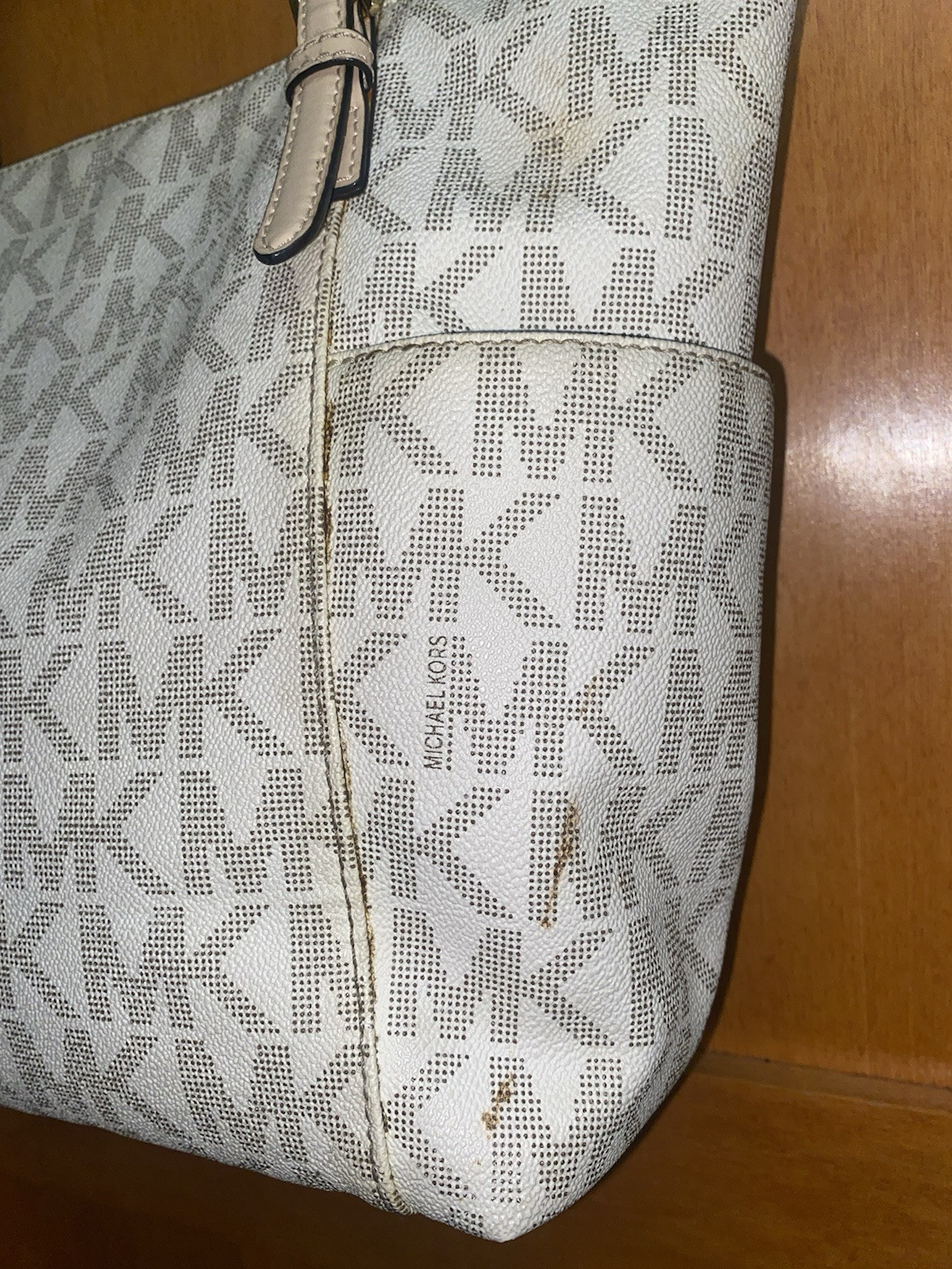 This MK Jet Set tote is a stylish steal! The tan monogram gives it a timeless look, and it's super spacious with plenty of pockets to stay organized. Love the adjustable straps for a comfy fit. The minor stains are barely noticeable—still looks chic! Perfect for work or weekend errands, and it's from a clean, smoke-free home. A great find for MK lovers!