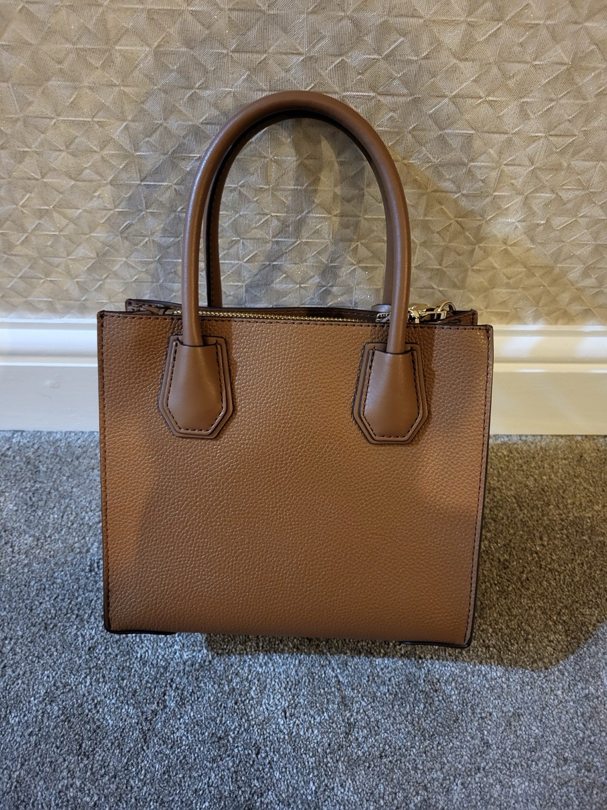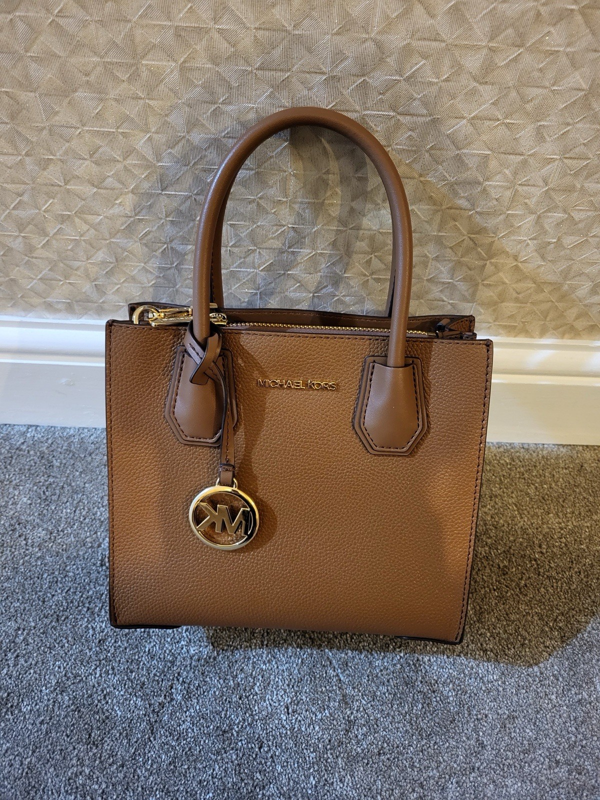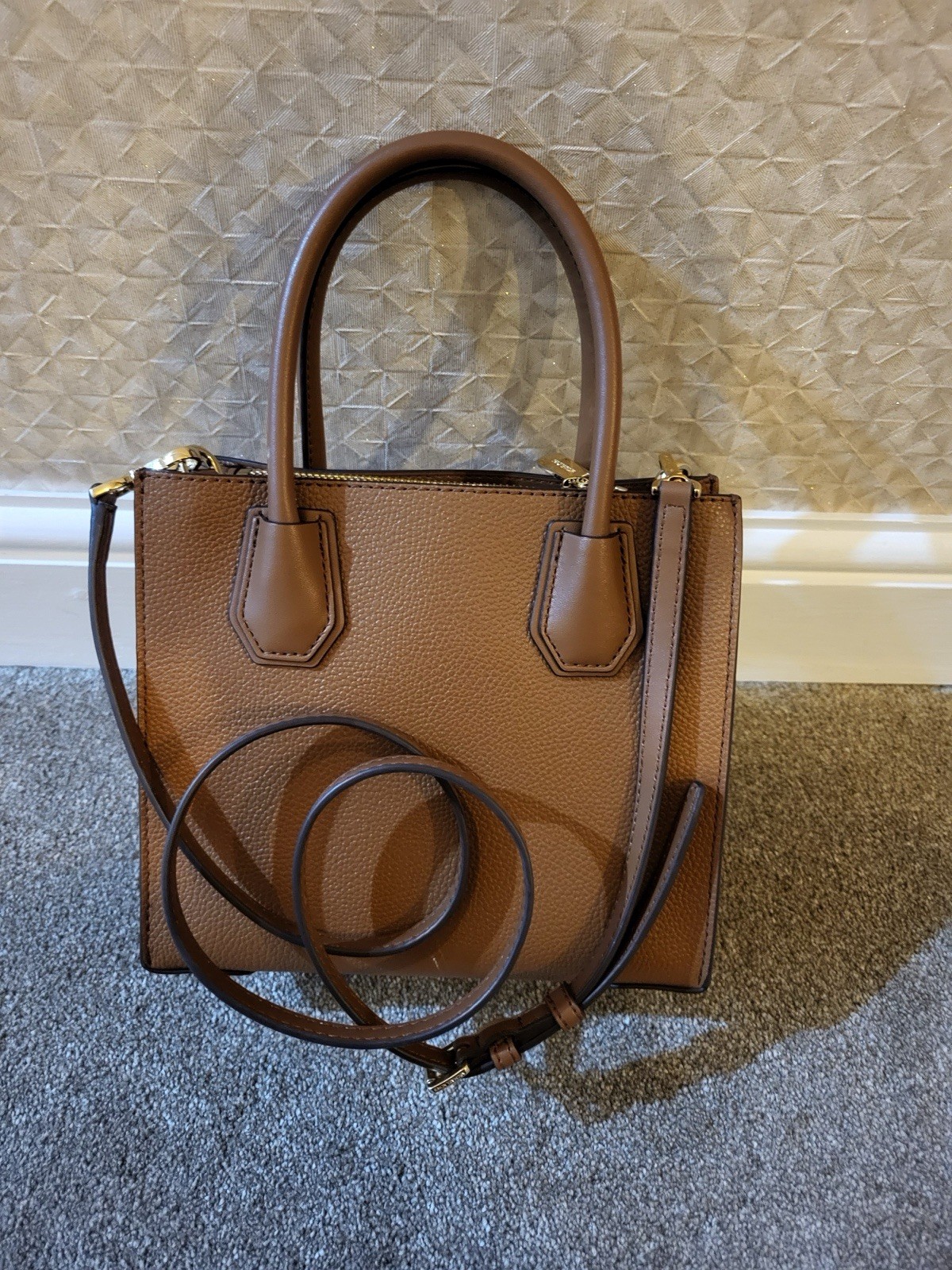 Pre-loved Michael Kors Mercer Medium Pebbled Leather Crossbody Bag in beautiful tan. This timeless piece is both stylish and practical, featuring a structured design, soft pebbled leather, and gold-tone hardware. The bag is in excellent condition — gently used and very well looked after. Clean interior and exterior with only minimal, hardly noticeable signs of wear. Details: Authentic Michael Kors Mercer style Color: Tan Material: Pebbled Leather (100% genuine) Hardware: Gold-Tone Dimensions: 8.75”W x 7.5”H x 4”D Handle Drop: 4.25” Adjustable Crossbody Strap: 22.25”–24.5” Interior: 2 open compartments, center zip pocket, 3 card slots Lining: 100% Polyester Dust bag not included Condition: ✔ Very lightly used ✔ No major marks or scuffs ✔ Clean inside and out ✔ Strap and hardware in excellent shape Features: ✨ Versatile – can be worn as a handbag or crossbody ✨ Durable, high-quality pebbled leather ✨ Classic tan shade matches any outfit Postage & Packaging: Will be carefully packed for safe delivery Dispatched within 1 working day