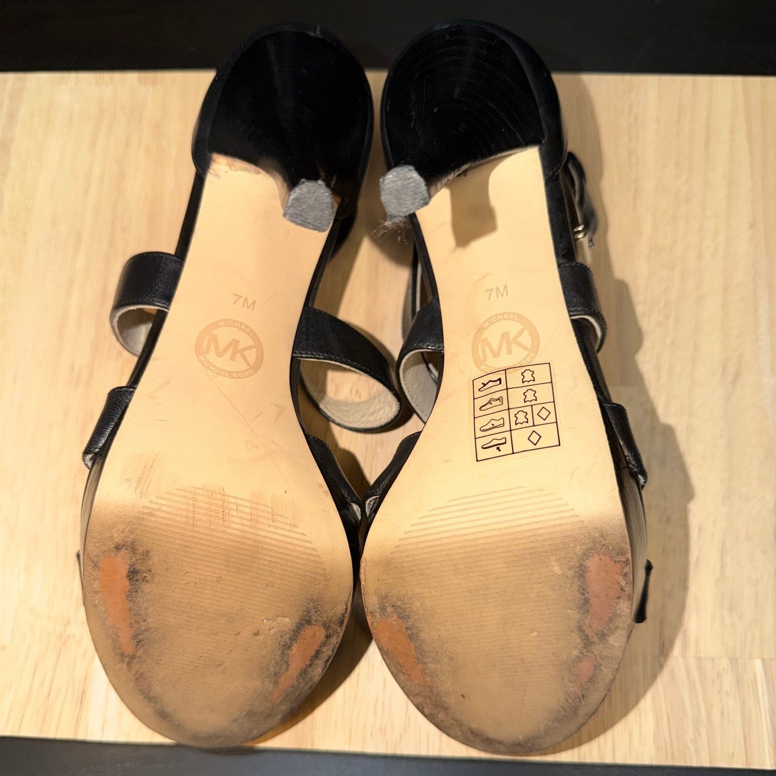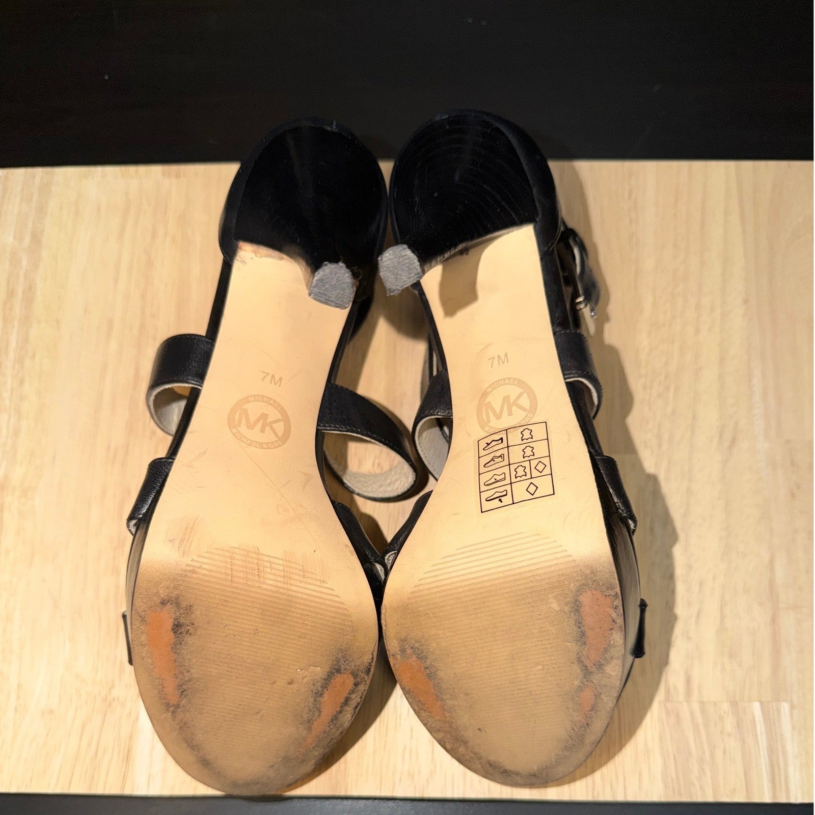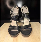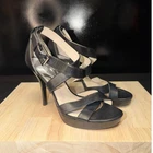 MICHAEL KORS women's black leather strappy platform stiletto heels. These stylish sandals feature multiple crisscross straps across the vamp and a secure ankle strap with a silver buckle closure. A substantial platform and a sleek stiletto heel create a flattering silhouette. The iconic MK logo is visible on the sole. Measurements: • Heel Height: 4.5 in • Platform Height: 1 in Style: Strappy Department: Women Upper Material: Leather, Polyurethane Heel Style: Stiletto Type: Heel Theme: Logo Toe Shape: Open Toe Pattern: Solid Heel Height: High (3-3.9 in) Closure: Buckle Features: Adjustable Strap, Straps Insole Material: Leather Outsole Material: Rubber Lining Material: Leather Accents: Logo Keywords: Michael Kors, black heels, leather sandals, strappy heels, platform shoes, stiletto sandals, evening wear, dressy shoes, MK shoes, designer heels, ankle strap heels, fashion sandals Item is preowned, effort has been made to ensure all flaws are displayed photos serve as additional description Sizing varies by manufacturer and time period, please see measurements.
